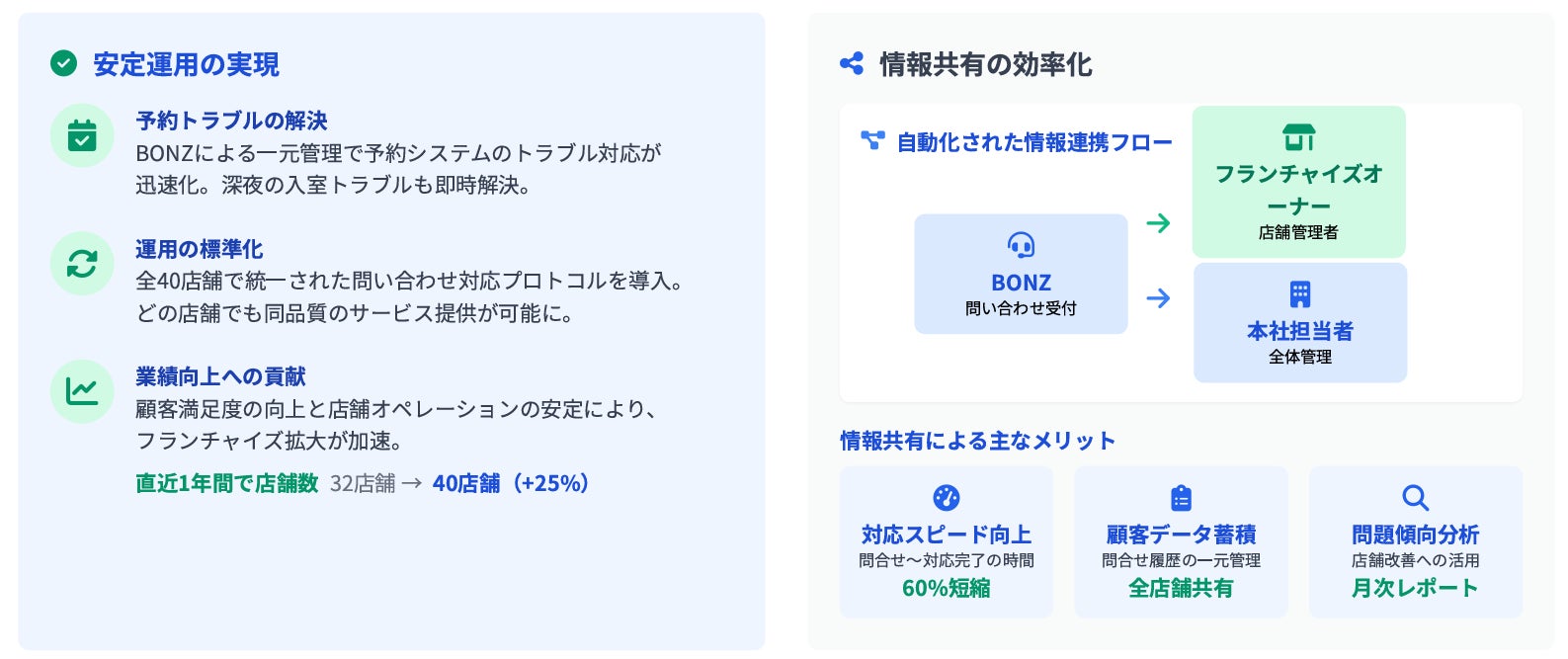 フランチャイズ店舗の急拡大に伴い複雑化していた電話対応を、ボンズのコールセンター代行サービスにより24時間365日対応可能な体制へと刷新。