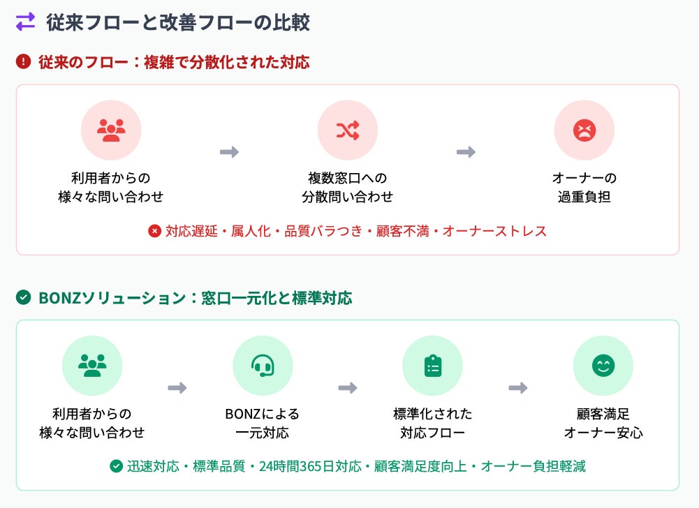夜間や緊急対応をボンズが代行することで、オーナーは集客・運営など本来業務に集中できる環境を実現。
