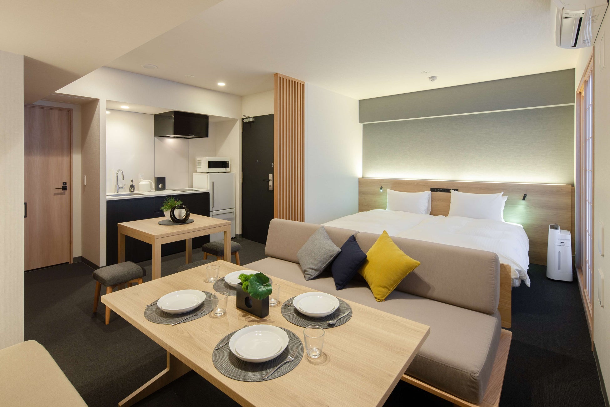 【サービス内容】コスモイニシアグループのコスモスホテルマネジメントが運営する、アパートメントホテル「MIMARU」は、キッチン、リビング・ダイニングスペース付きの約40㎡からの広い客室を備え、“みんなで泊まる”を楽しむアパートメントホテルです。