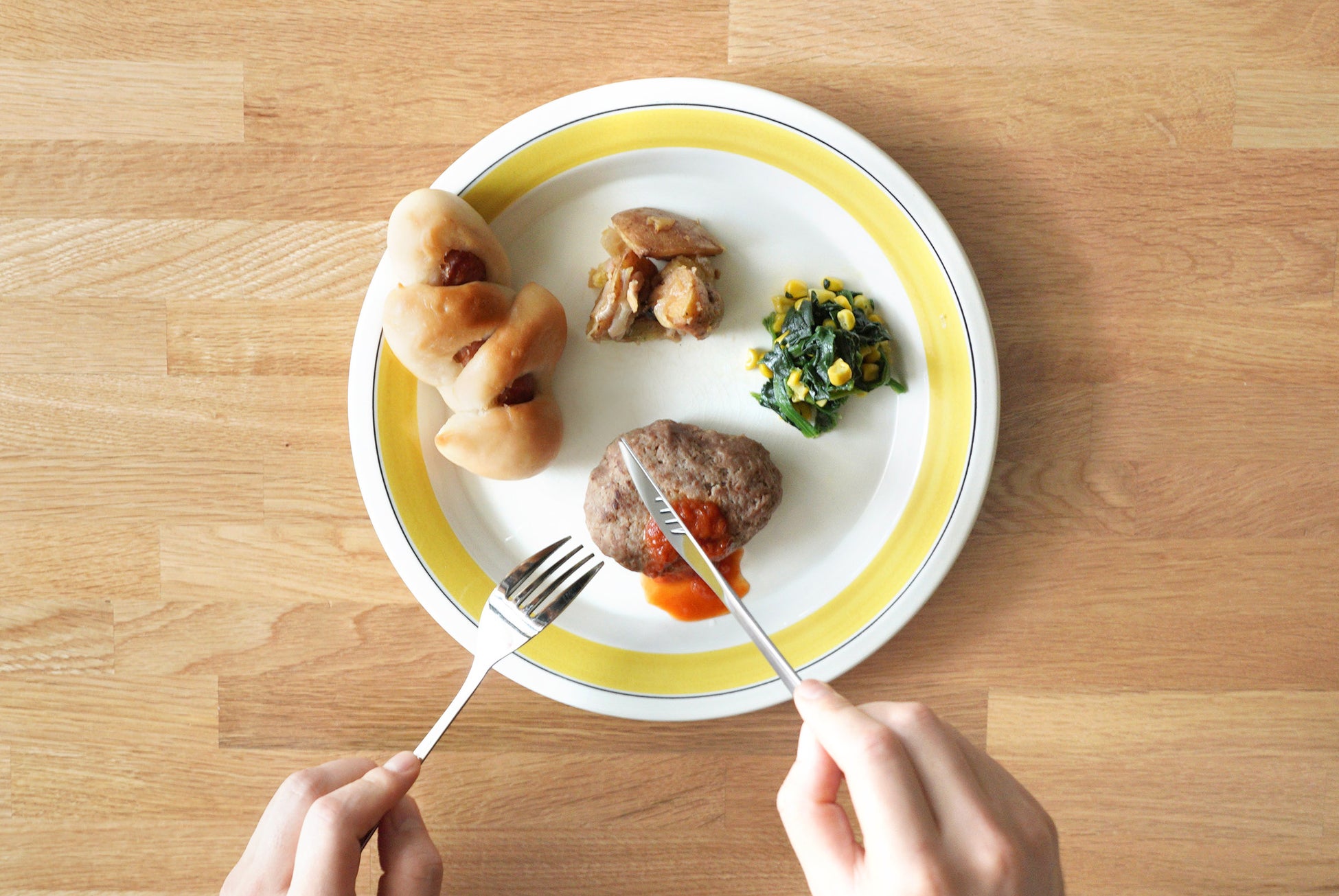 【内容】ウインナーパン、ハンバーグ トマトソース、ジャーマンポテト、ほうれん草とコーンのソテー