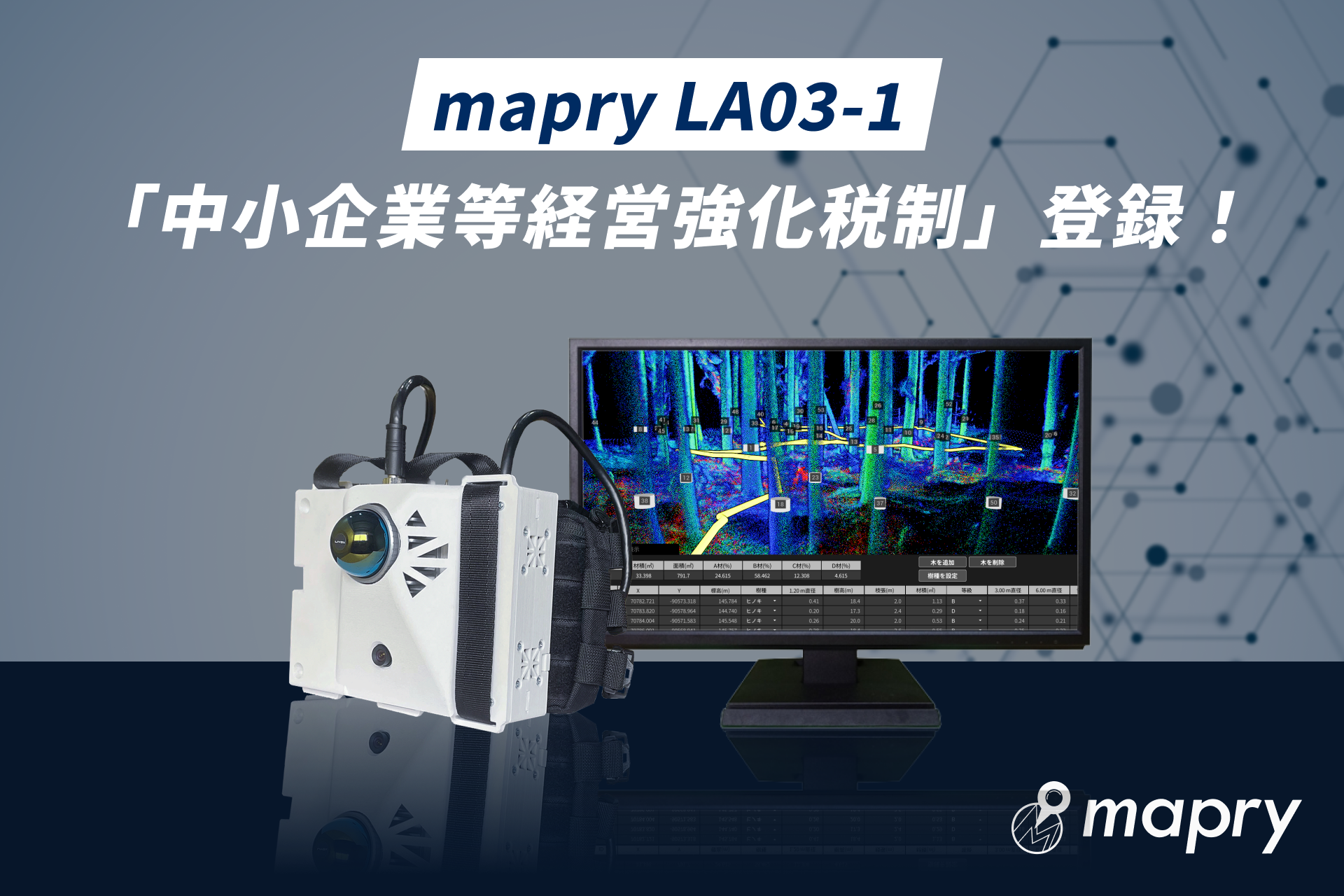 株式会社マプリィ(本社:兵庫県丹波市、代表取締役:山口 圭司)は、森林計測LiDAR「LA03-1」が、経済産業省・中小企業庁が実施する「中小企業等経営強化税制」の対象製品として登録されたことをお知らせいたします。