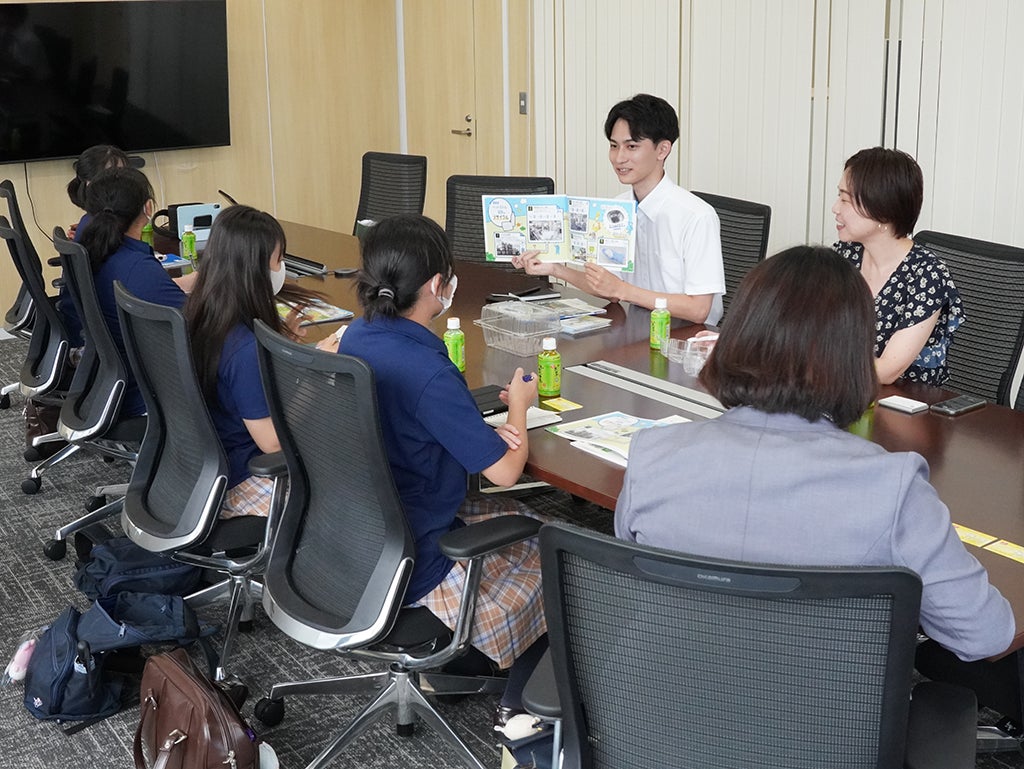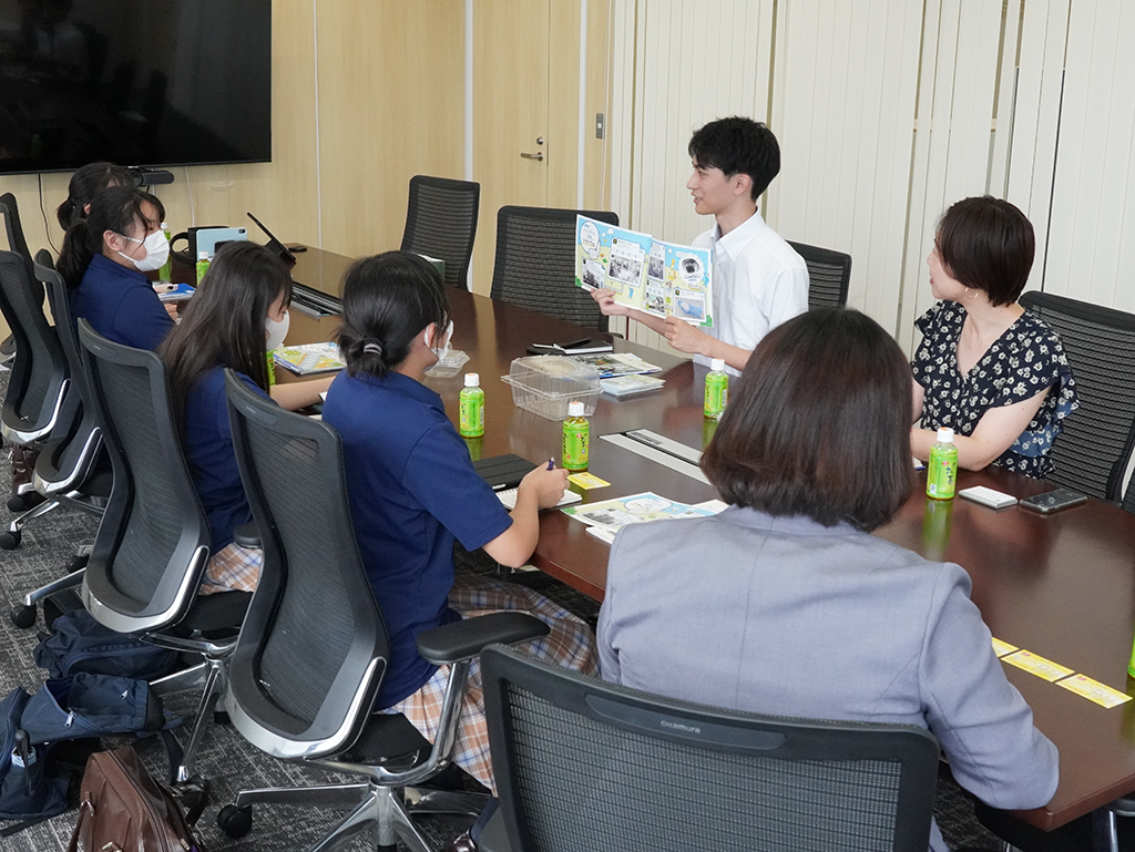 品川女子学院の生徒の方々には、エフピコチューパ本社へお越しいただき、エフピコチューパが扱っている製品を実際に見ていただき、特にペットボトルリサイクル素材であるエコAPETについて詳しくご説明をしました。また、エフピコグループのSDGs実現に向けた取り組みとして、エフピコ方式のリサイクルを始め、障がいのある方との取り組みなど企業活動についても取材していただきました。