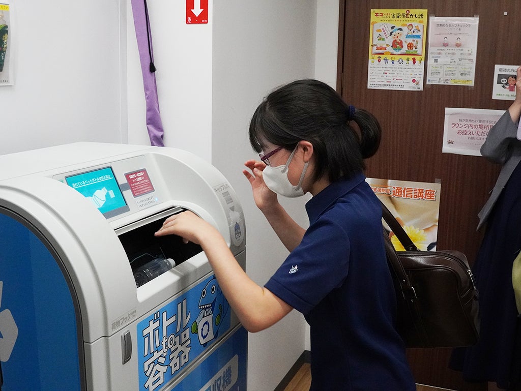 エフピコグループ事務所内に設置している、ペットボトルを潰し回収を容易にする機械「ボトルスカッシュ」を使用していただくことで、使用済み容器の回収というリサイクルの流れについて体験してもらいました。