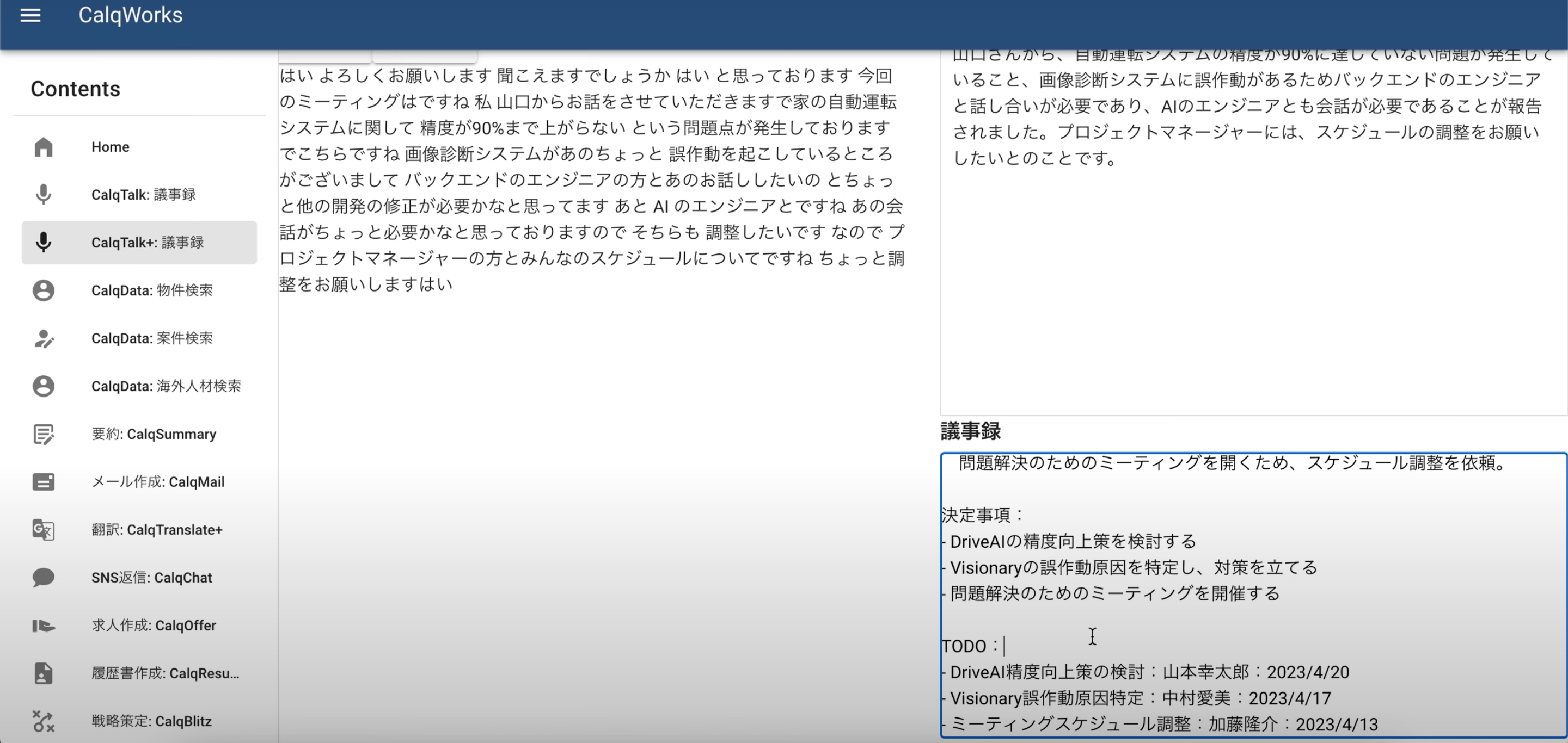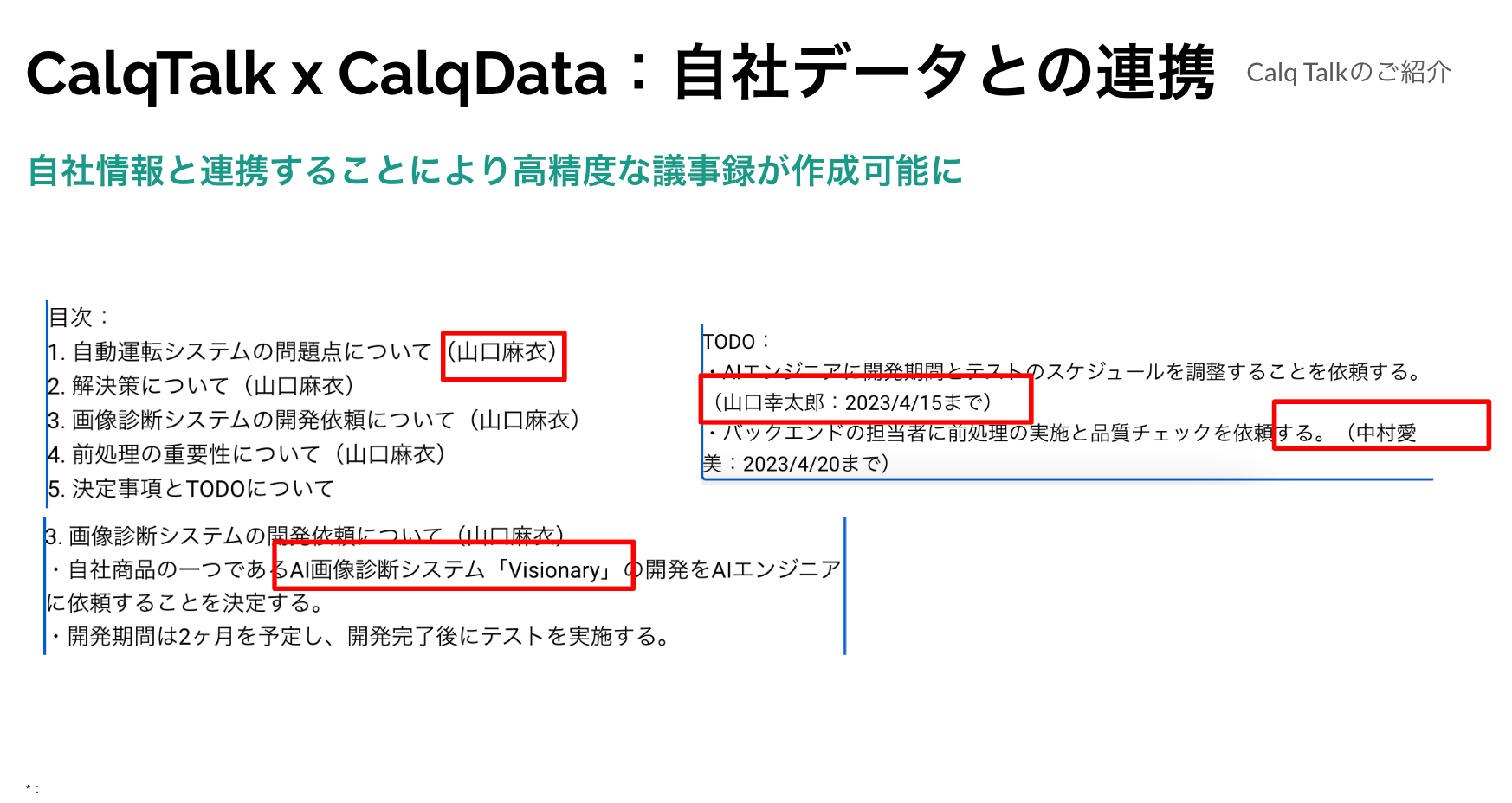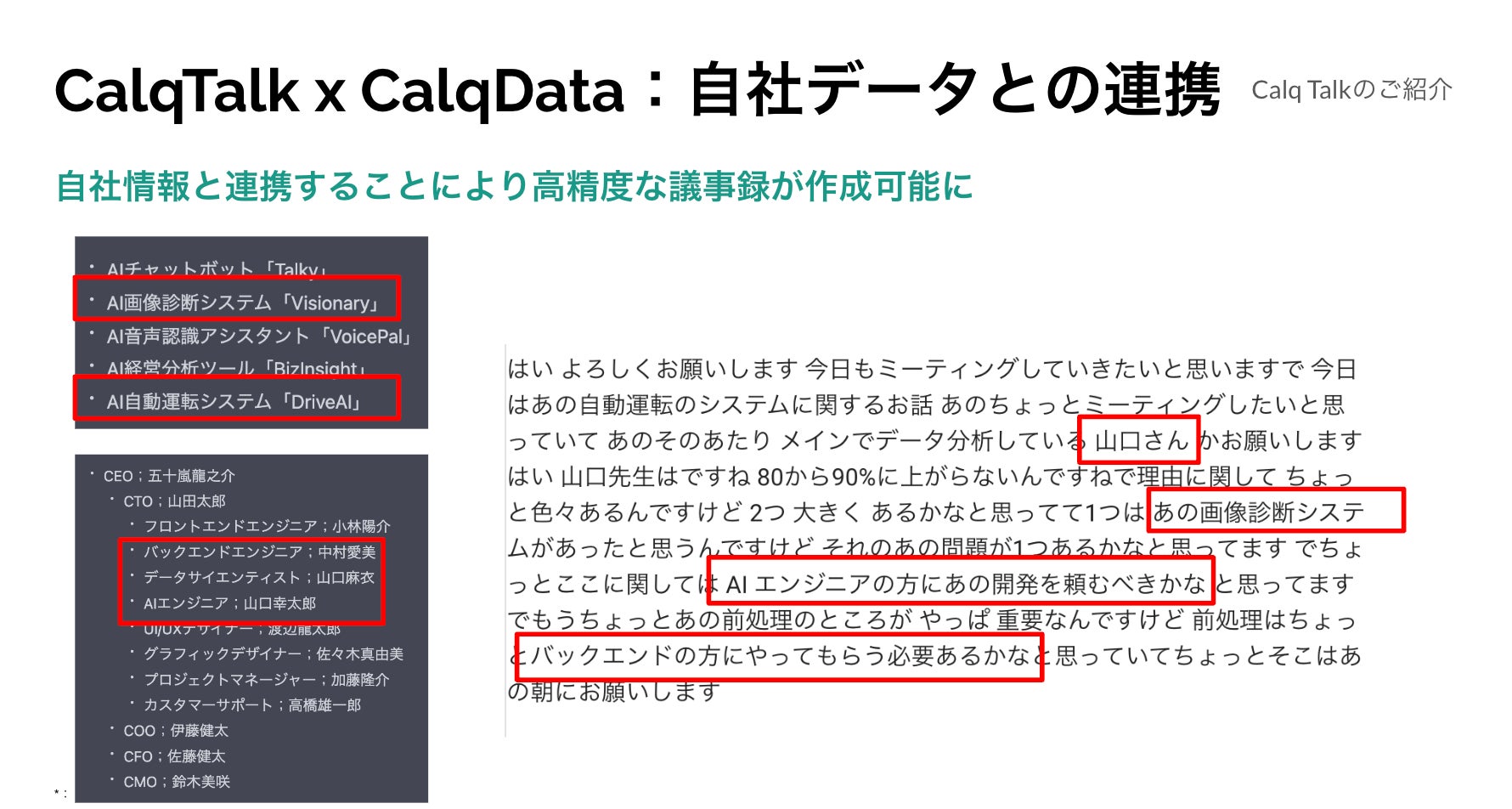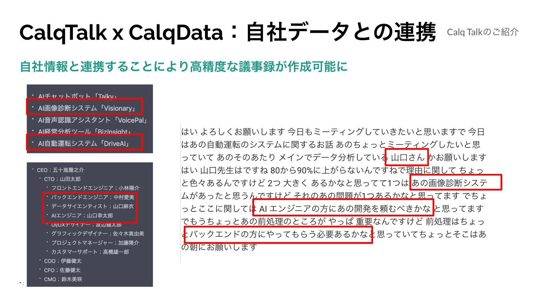 また、弊社のリアルタイムAI議事録と連携することで、会議のリアルタイムな議事録化とリアルタイムな自社情報提案(過去の議事録、商品情報など)を行うことが可能となります。以下では弊社のGPT-4搭載リアルタイム議事録「CalqTalk」に「CalqData」による自社データを連携し、会話のみでは判別できない情報を加えた上で議事録を記述している様子になります。これにより部門外の商品データや人材情報、Webサイトの情報を取得し、人間の行う議事録作成以上の記述と提案が可能となります。