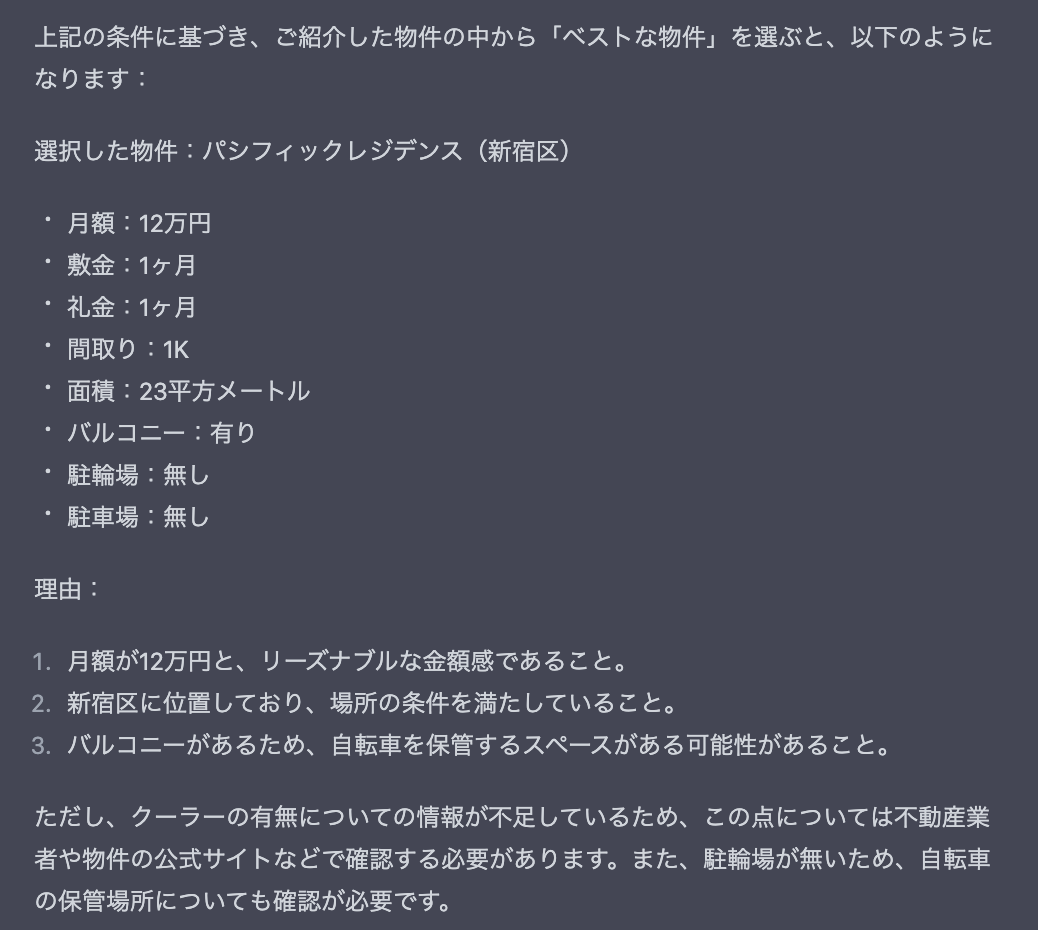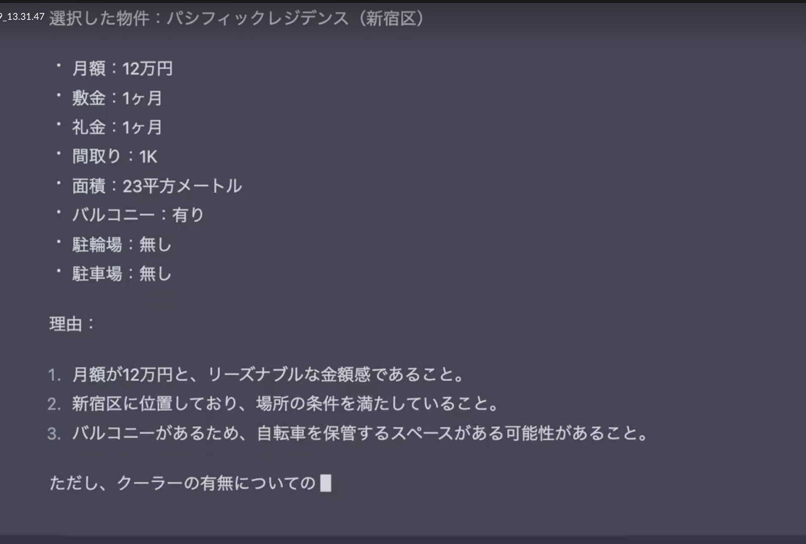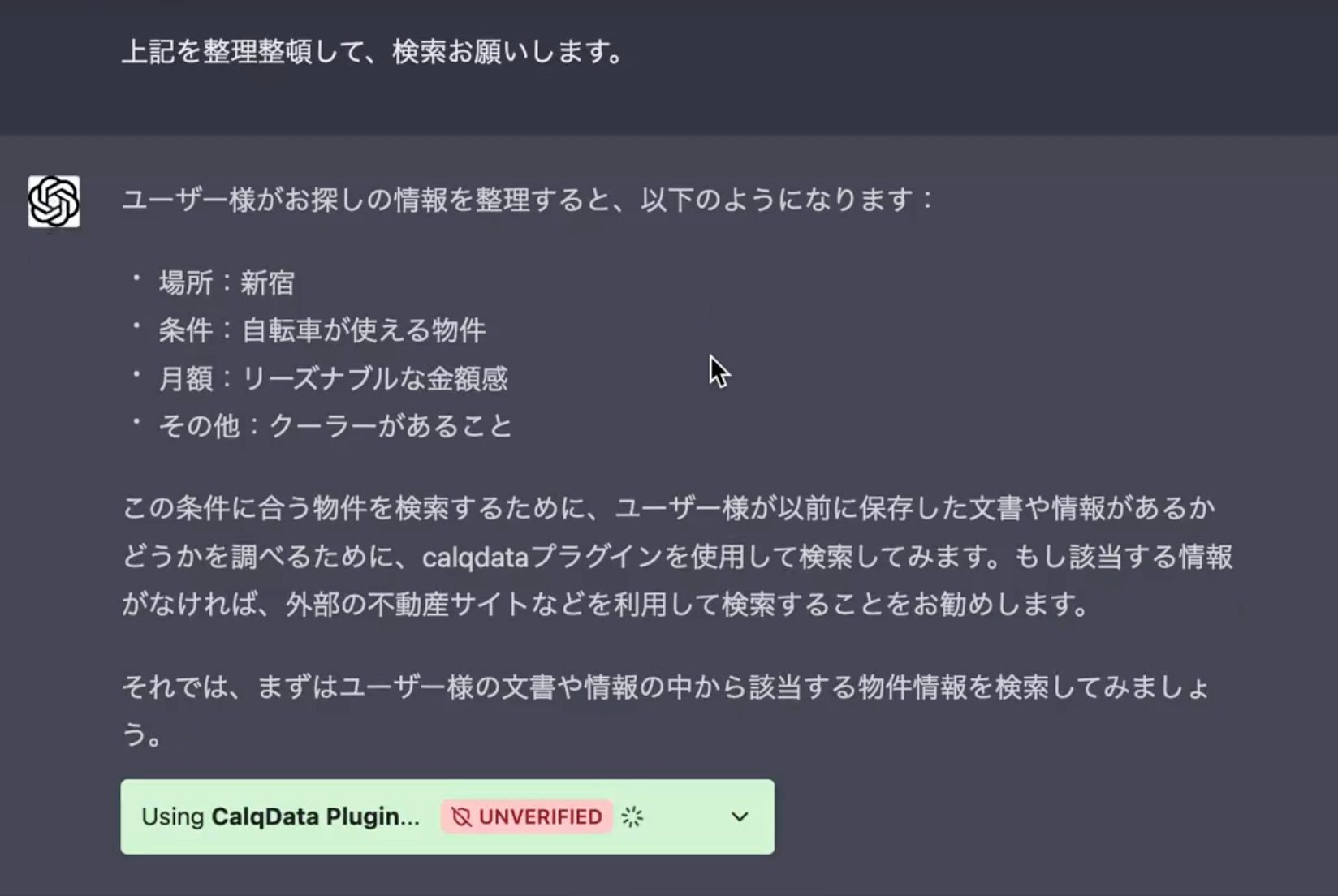 以下のデモではChatGPT Plugin(緑色のCalqData Plugin)を用いて賃貸データベースにアクセスし不動産情報を対話形式で提案している様子になります。ChatGPTの高度な思考力を活かし、ChatGPTがユーザーの希望である自転車が使える物件よりも価格の安さを優先し、自転車はバルコニーに置くことが出来るなど総合的な解釈のもとの提案を可能としています。