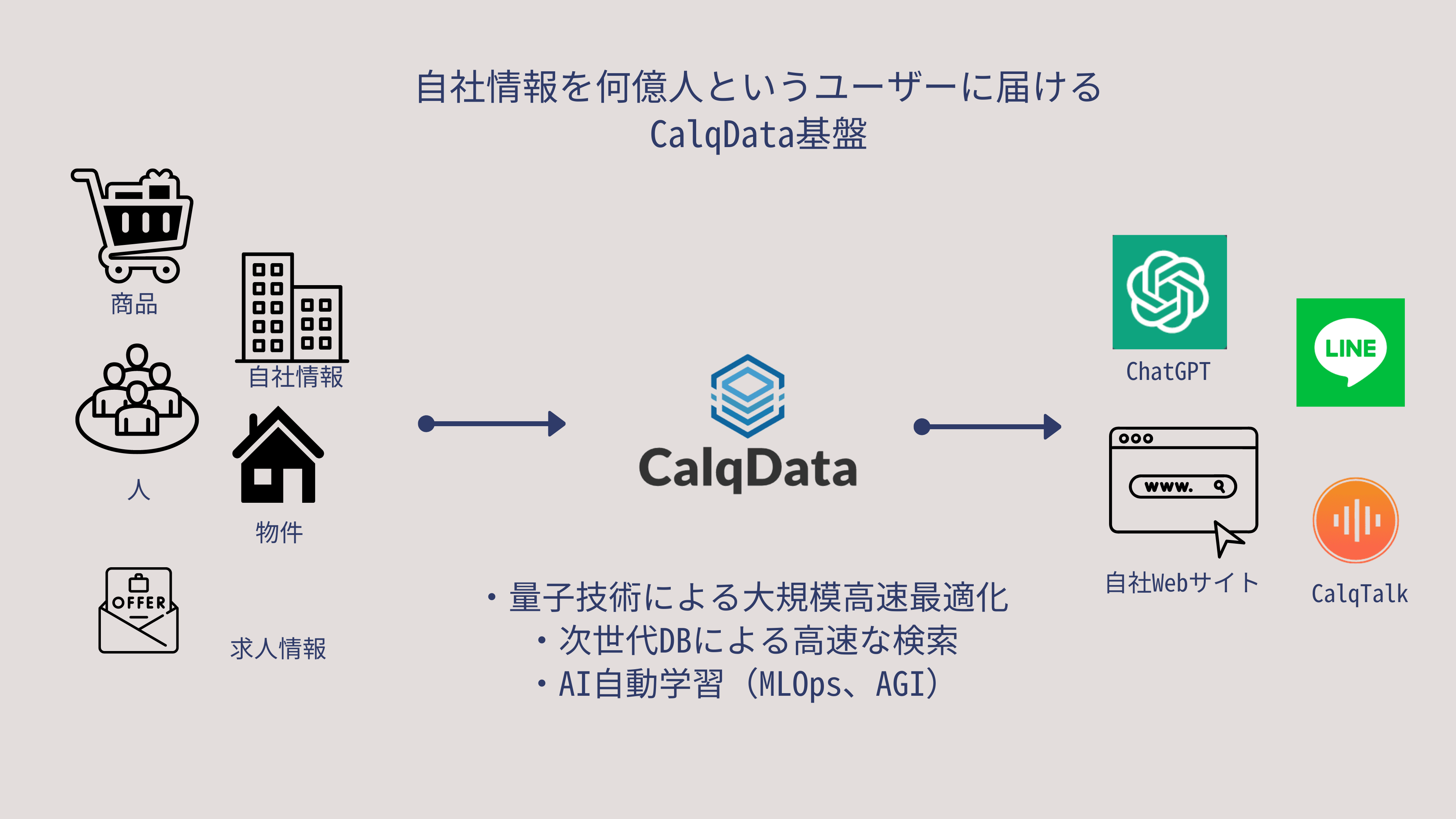 株式会社KandaQuantumは今回新たにCalqData(カルクデータ)というサービスを発表しました。CalqDataは自社データをChatGPT PluginsやLINE、自社Webサイト等に自社情報を載せて国内数百万人、世界何億人という顧客にリーチするサービスです。ChatGPT Pluginsは、ローンチからわずか2カ月後の1月に月間アクティブユーザー数が1億人に達したと推計*1され、史上最も急速に成長しているChatGPTの上で動くアプリケーションです。