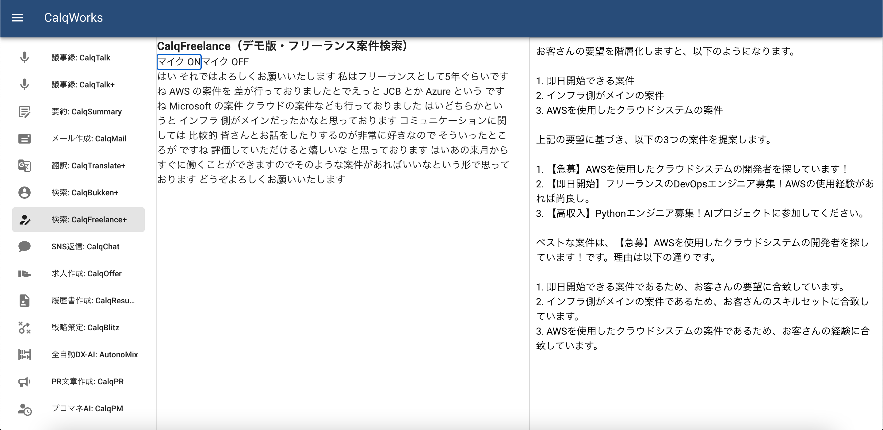 *自社WebサイトとCalqDataを連携した例。自社のフリーランス案件情報と高度なAIを連携し、音声入力、文字起こし、内容の整理と議事録化、案件の提案、提案理由を瞬時にAIによって行うことが可能となります。