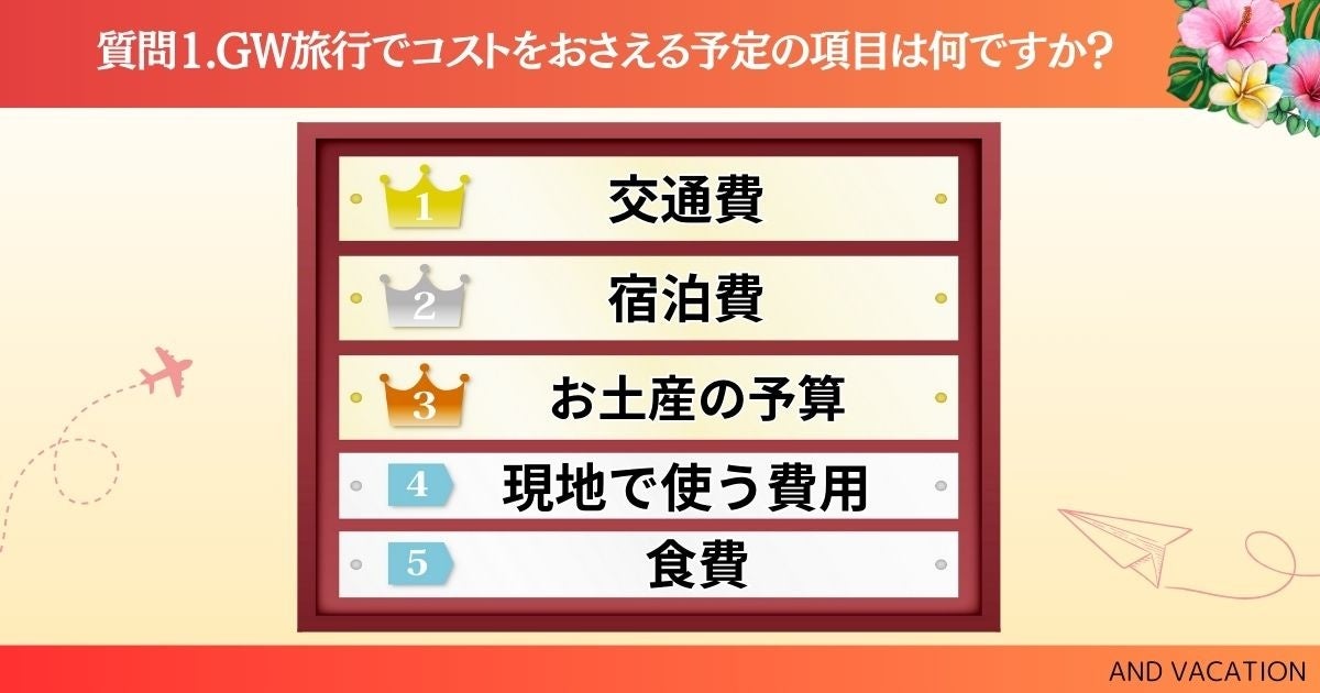そこで、GW旅行でコストをおさえたい項目についてアンケートで聞き取り調査をしました。ぜひ、チェックしてみてください!