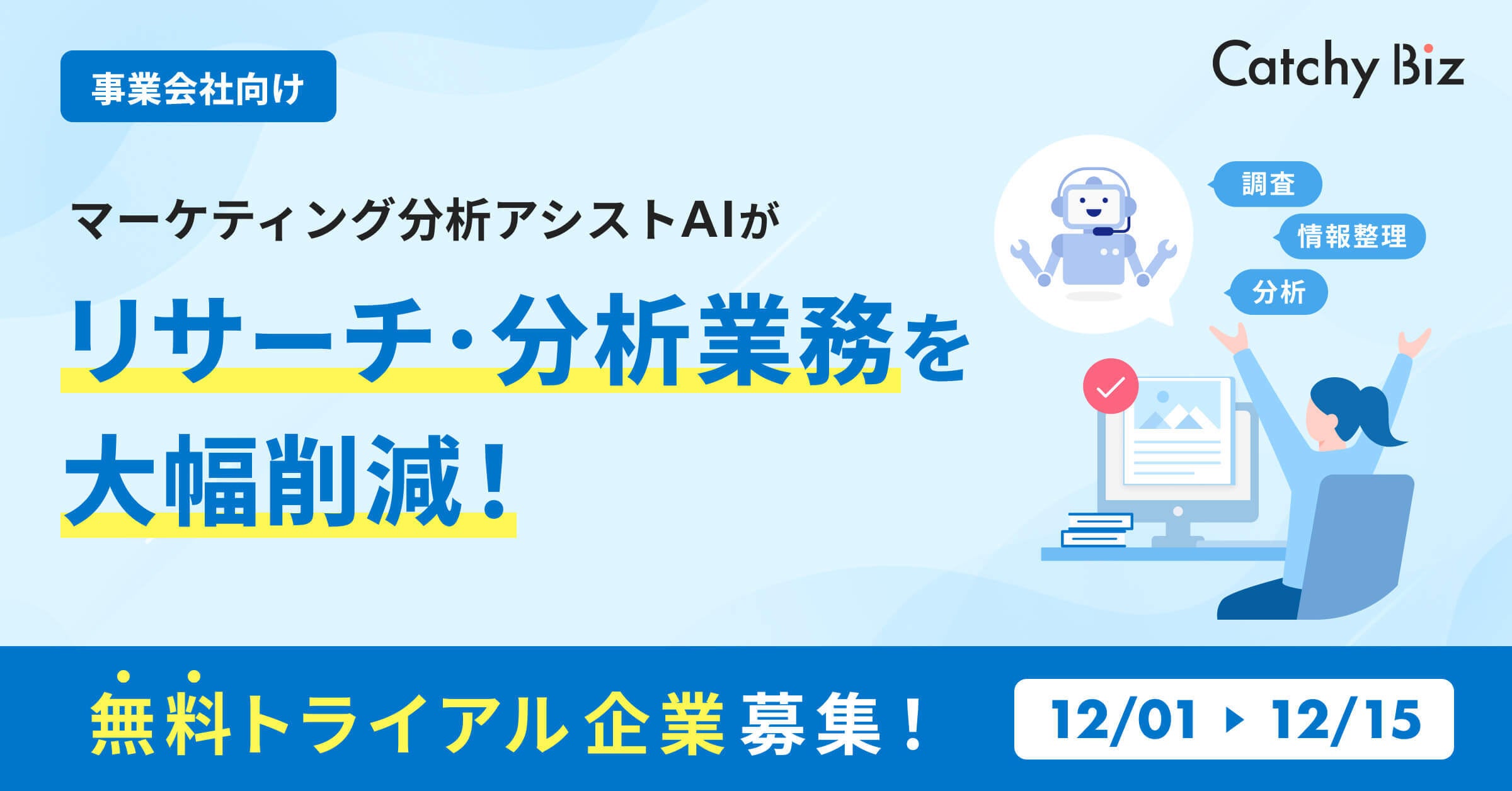 当社は、事業会社におけるマーケティングプロセスの効率化と革新を目指し、マーケティング分析業務をサポートするAIアシスタントサービス「Catchy Biz」を提供しています。