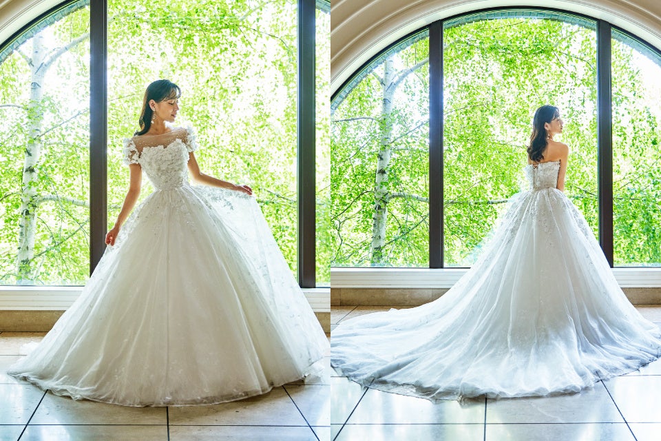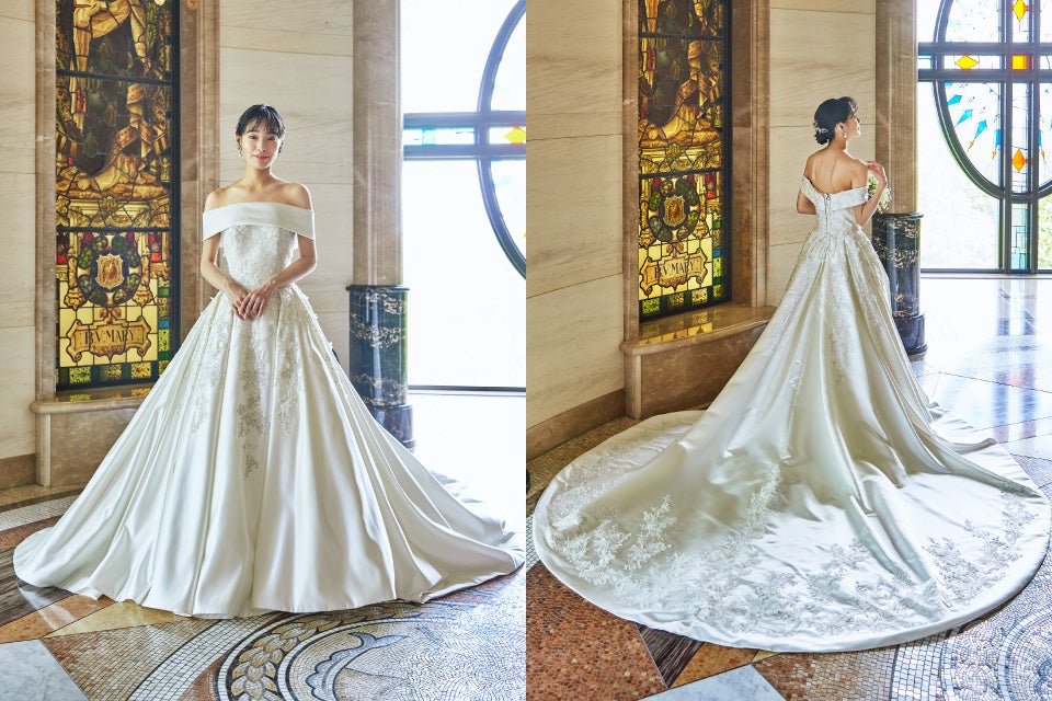 ロングトレーンを広げると裾に広がる芸術的なレース模様に心を魅了される1着です。