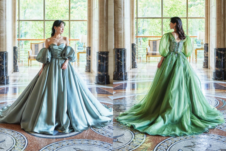 グリッターチュールのオーバードレスは輝きと豪華さを、艶のあるサテン生地からは上品さを感じられる多彩なドレスです。