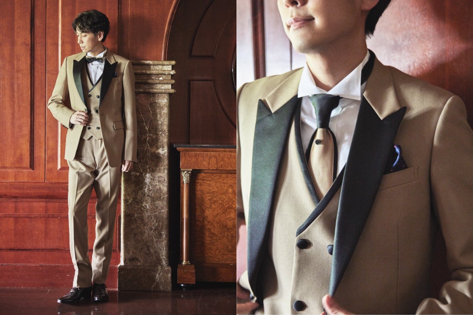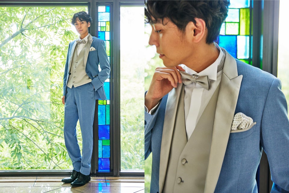 また、タキシードではこれまでDESTINAになかった白のアイテムや、遊び心あふれるブラック×ブラウン、グレー×ブルーのバイカラーを取り入れたアイテムが登場。王道アイテムだけでなく、おしゃれにこだわりたい花婿様にも選んでいただけるラインナップが揃っています。