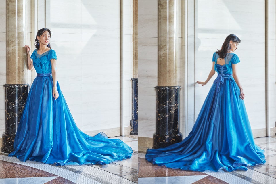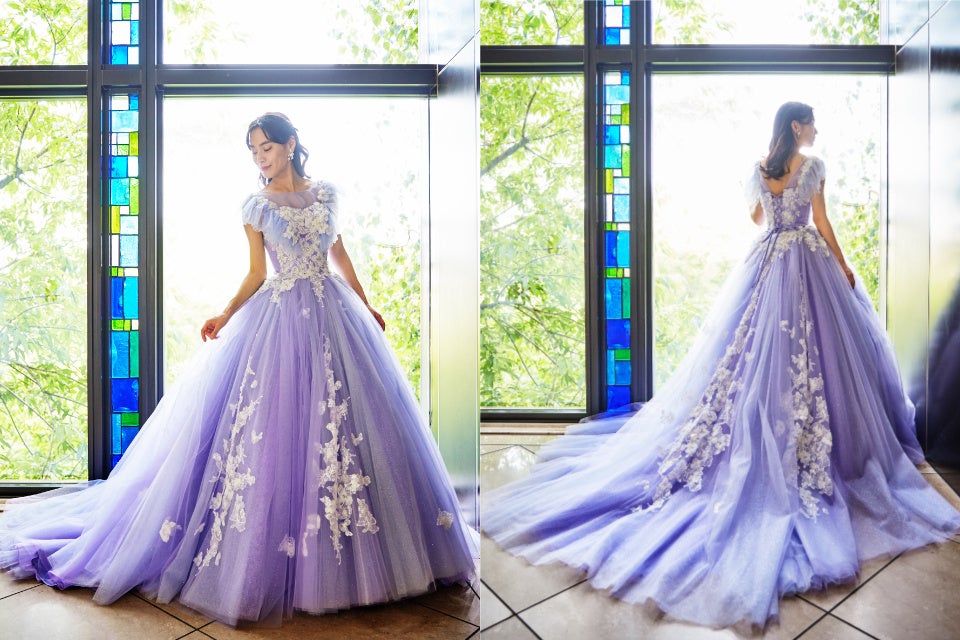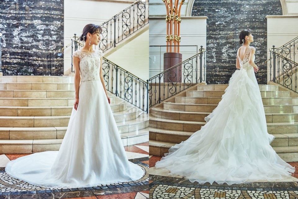 シャンテリーレースを使い優しい大人の印象にまとめたこのドレスには、取り外し可能なフリルトレーンがあり、トレーンをつけることでバックスタイルがより一層豪華に見えます。