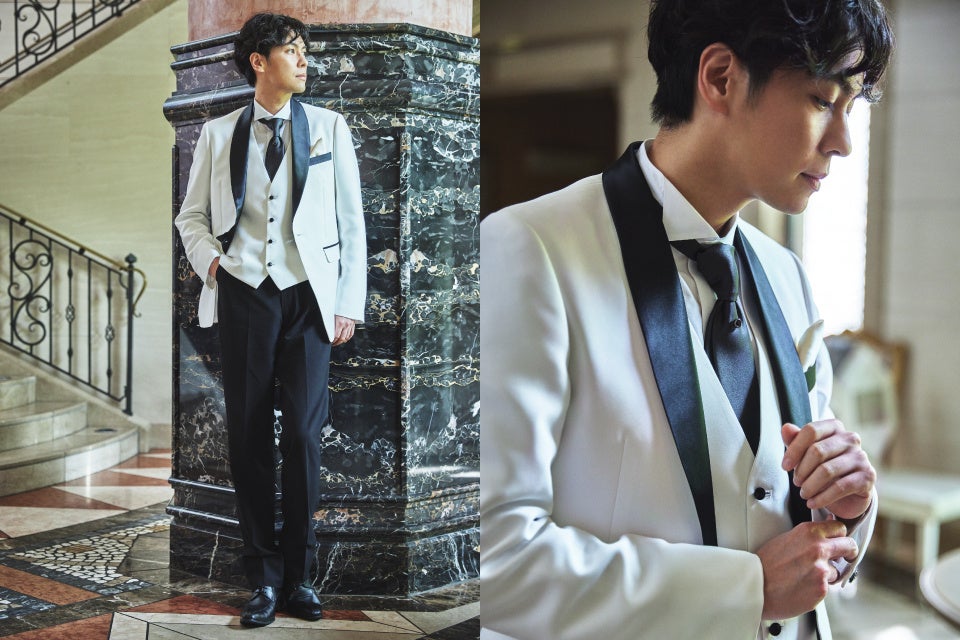 モノトーンで仕上げたオトナの白タキシード。メリハリを利かせるために生地の白さにこだわりました。