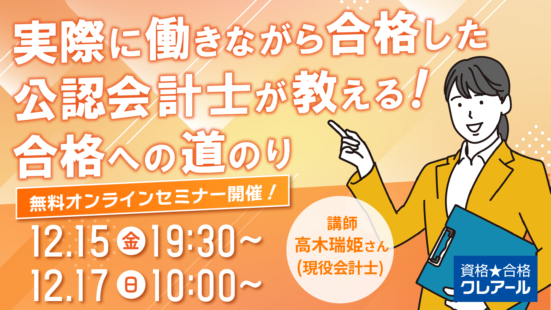 株式会社クレアール公認会計士講座では、働きながら公認会計士試験に見事合格された髙木 瑞姫先生をゲストにお招きし、社会人受験生に向けたオンライン特別セミナーを開催することが決定いたしました!