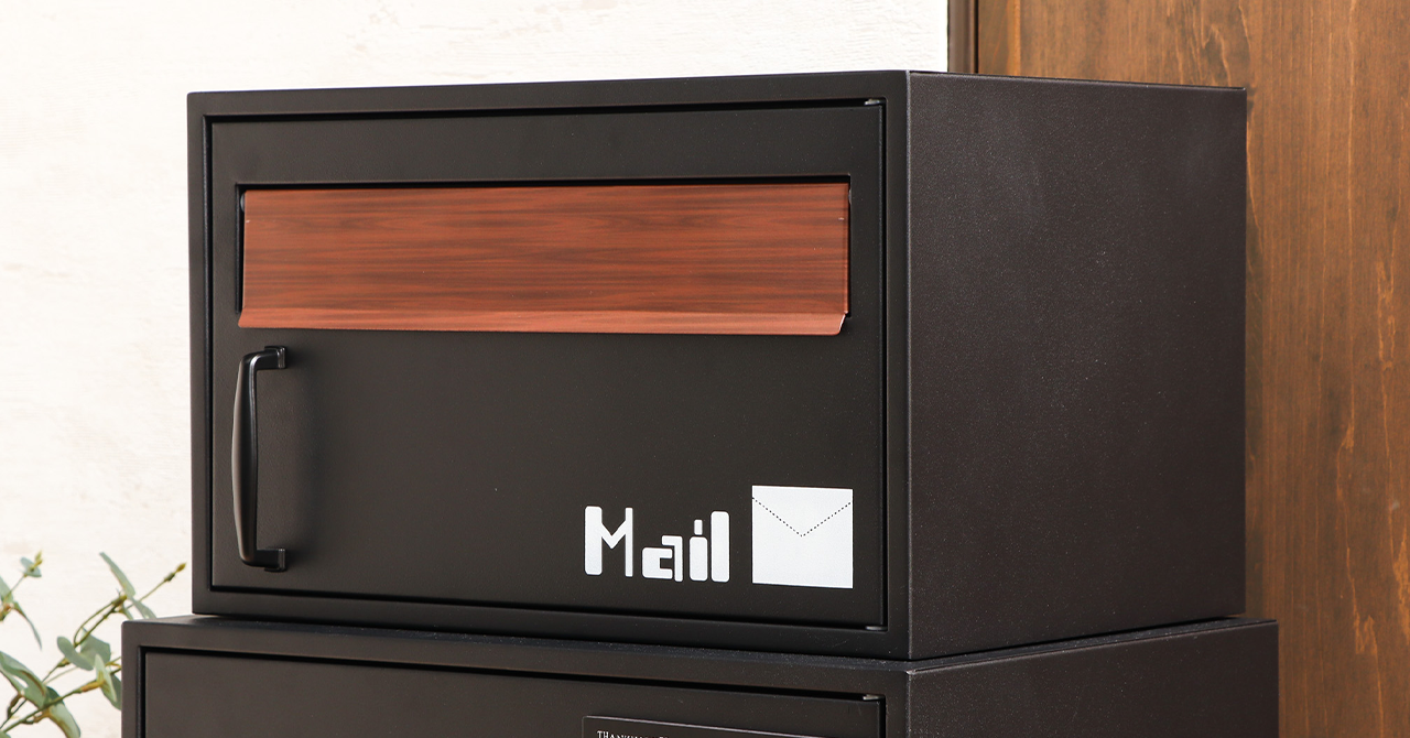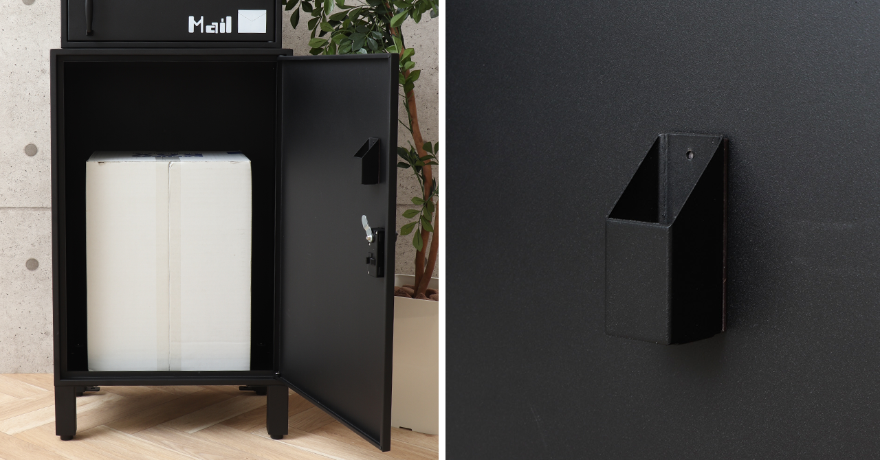 ロボットのようなカクカクしたフォルムがユニークなポスト一体型宅配ボックス(ヒューム)は、上部が郵便ポスト、下部が宅配ボックスとなっています。どちらも大容量でメールボックスはA4ファイルや回覧板もストンと入り、宅配ボックスは120サイズ程度の大きな荷物もOK。不在時も安心して受け取れます。こんなに大容量なのに圧迫感がないのは、ただの箱型ではないデザインのおかげ。自宅の前にロボットが立っているようなそんな楽しい景観も手に入る宅配ボックス付きポストです。真っ黒なボディに投函口の木目と、遊び心ある白のロゴがアクセントになっています。
