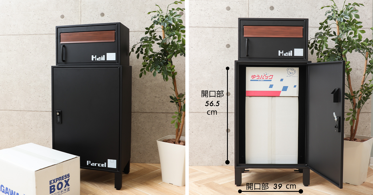 宅配ボックス部分の内寸はw44xD31xH62で、120サイズのダンボール箱など大きめの荷物も収納可能です。小さいものなら複数個入るので不在時も安心して受け取れます。