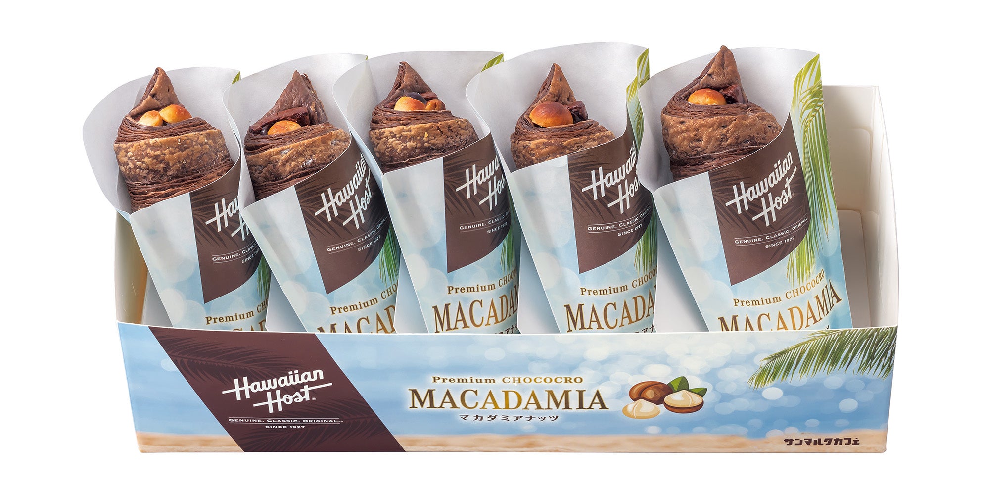 昨年、サンマルクカフェはハワイの老舗チョコレートメーカー・ハワイアンホーストと初のコラボレーションを果たし、期間限定メニューは大変ご好評をいただきました。本年は、ハワイアンホーストを代表する商品「マカデミアナッツチョコレート」をさらに感じられるようにアップグレードされたメニュー「プレミアムチョコクロ ハワイアンホースト ごろっとマカダミアナッツ」が新登場いたします。昨年比140%のマカダミアナッツを使用した本商品は、昨年以上のマカダミアナッツの香りや味わい、さらにはザクザクとしたナッツの食感を十分にお楽しみいただけるほか、クロワッサン生地に練り込まれるチョコレートを増量し、昨年以上にチョコレートの香りや味わいも感じられるようになりました。また、生地で包むチョコレートには、今回のコラボに際して開発したオリジナルチョコレートクリームを加えており、ハワイアンホーストを代表する商品「マカデミアナッツチョコレート」のマイルドな味わいを限りなく再現いたしました。