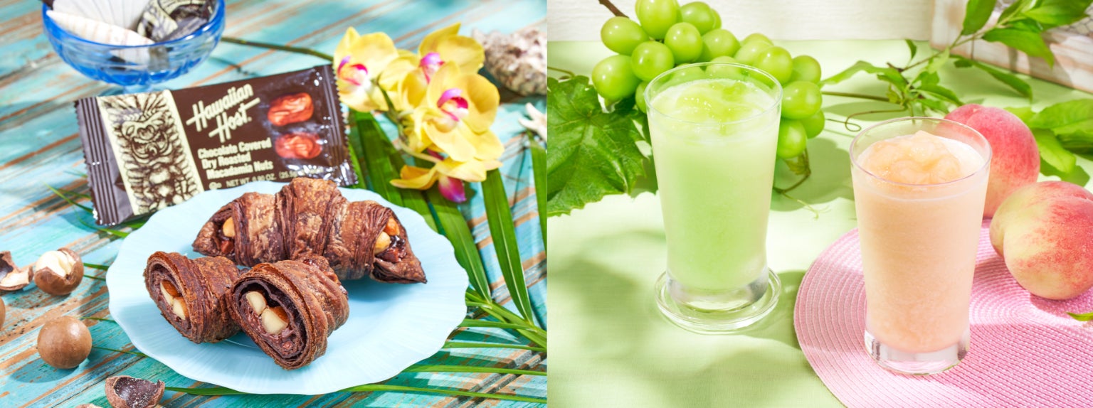 株式会社サンマルクカフェ(本社:岡山県岡山市 代表取締役社長:鎌田 滋之)は、7月26日(金)より、昨年の販売にてご好評をいただいた、ハワイの老舗チョコレートメーカー・ハワイアンホーストとのコラボレーション商品をアップグレードさせた、「プレミアムチョコクロ ハワイアンホースト ごろっとマカダミアナッツ」を発売いたします。また、サンマルクカフェ史上初の、国産シャインマスカットを使用したスムージー「シャインマスカットスムージー ~シャインマスカットジュレのせ~」や山梨県産白桃を使用※したジューシーでみずみずしい果汁の甘さを感じていただける「山梨県産白桃スムージー ~白桃果肉ソースのせ~」、暑い夏にぴったりの、ハワイのビーチをイメージした涼しげなブルーのソーダ「ハワイアンブルーパインソーダ」を同時発売いたします。