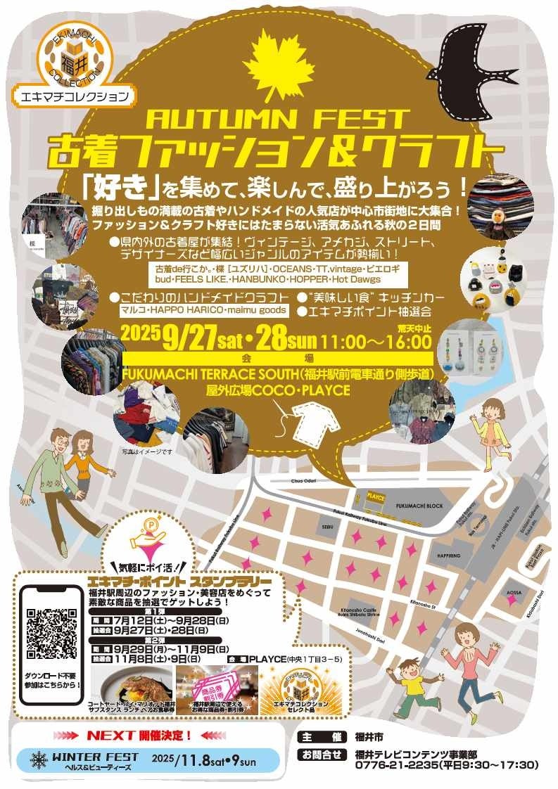 福井市の中心市街地でヴィンテージ、アメカジ、ストリート、デザイナーズなど幅広いジャンルの古着屋や、ハンドメイドクラフトのお店が集まる「エキマチコレクション オータムフェス 古着ファッション&クラフト」を 開催します。