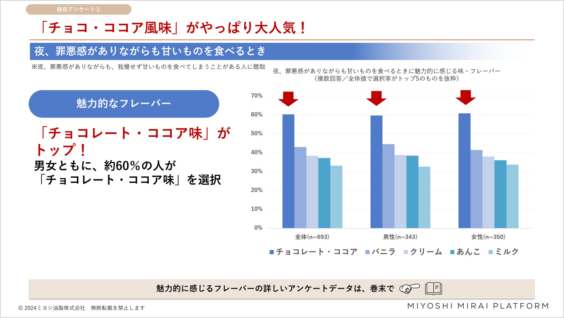 【ミヨシ油脂】独自調査「2024年下半期の消費トレンド予測」発表、時間帯で変わる消費行動に注目、前年比で夜に甘いものを食べる消費者は2割増、求めるのは「チョコレート・ココア味」が6割