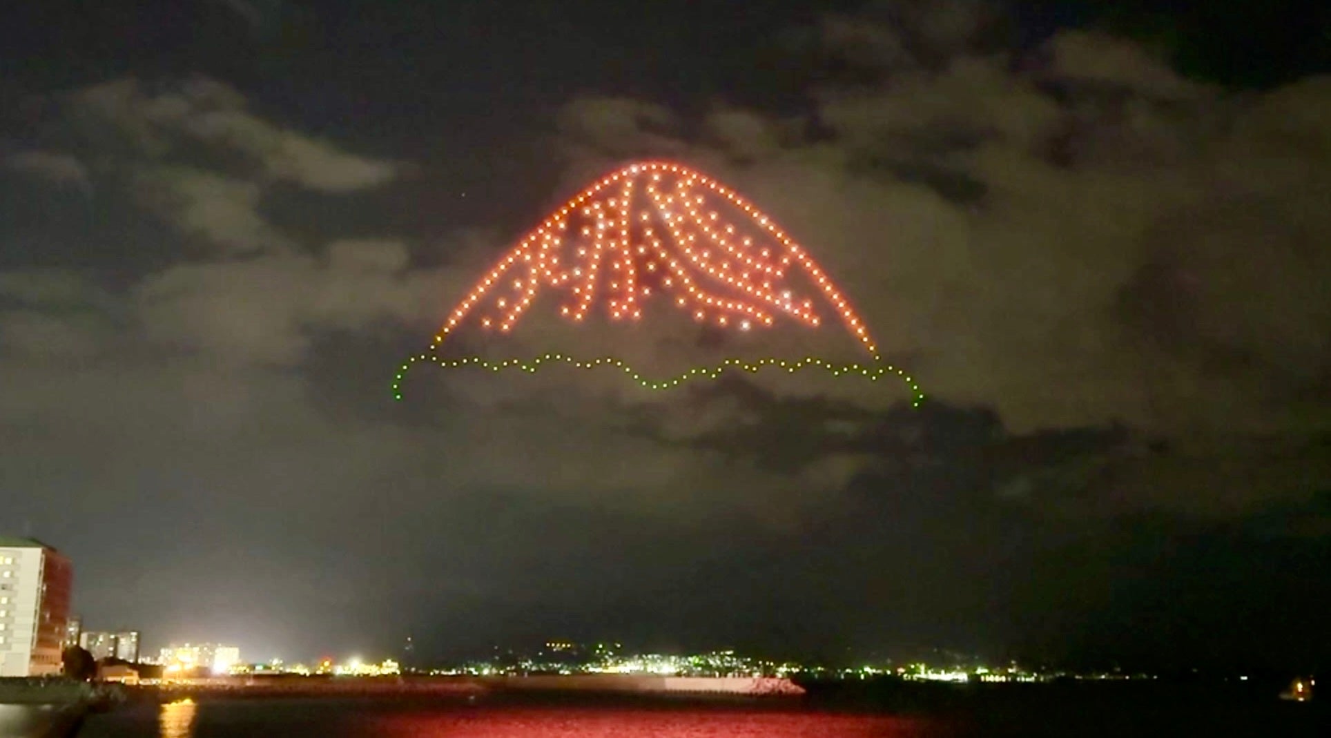 スペシャルドローンショーは、レッドクリフと株式会社Wells Be(本社:大分県別府市、代表取締役:金夕貴、以下「Wells Be」)の共同制作で行われました。300機のドローンが夜空に舞い上がり、別府市政100周年のロゴや、扇山火祭りなどをモチーフにしたアニメーションを次々と描き出しました。