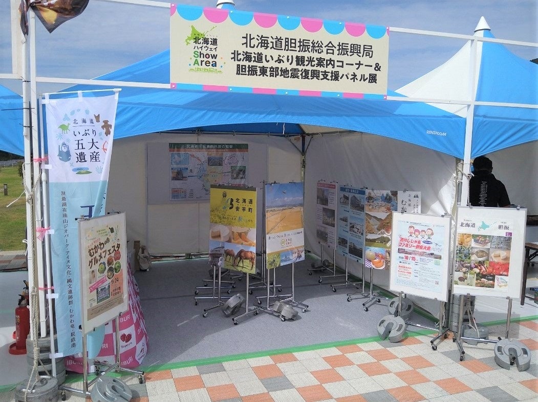 令和5年(2023年)9月16日(土)、9月17日(日)に道央道有珠山サービスエリアで開催された「北海道ハイウェイShow Area 2023 in 有珠山SA」に出店。胆振総合振興局ブースでは、厚真町、安平町、むかわ町の復興支援のための「胆振東部地震復興支援パネル展」を実施しました。
