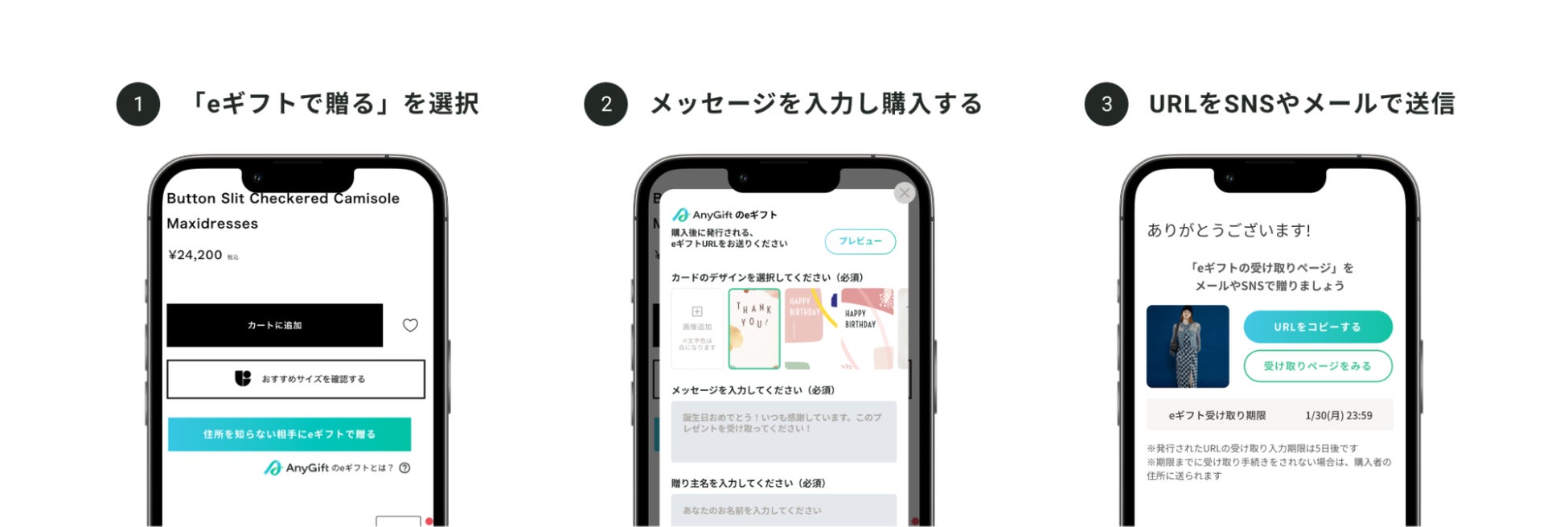 AnyGiftは、相手の住所を知らなくてもLINEやメールで贈ることができる"eギフト機能"を、ECサイトに組み込むことができるサービスです。