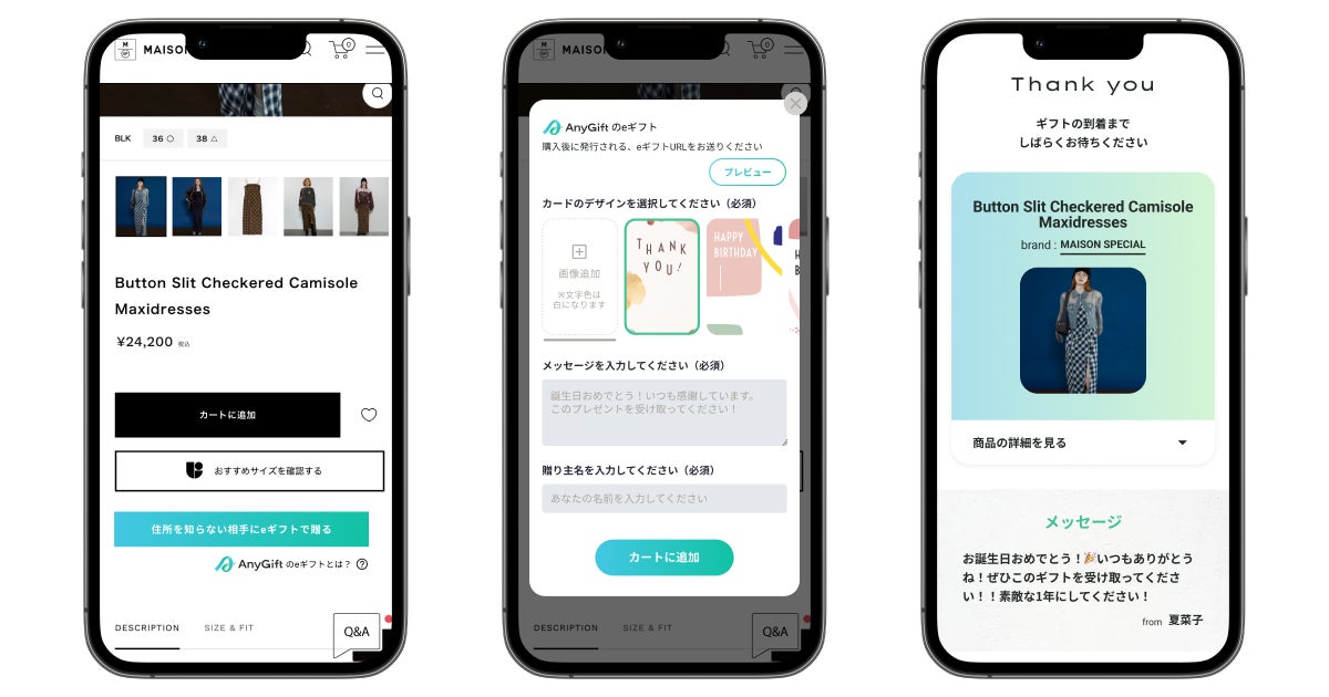 今回、当社のAnyGiftの提供により、「MAISON SPECIAL 公式オンラインストア」にて人気商品などがeギフトとして贈れるようになります。