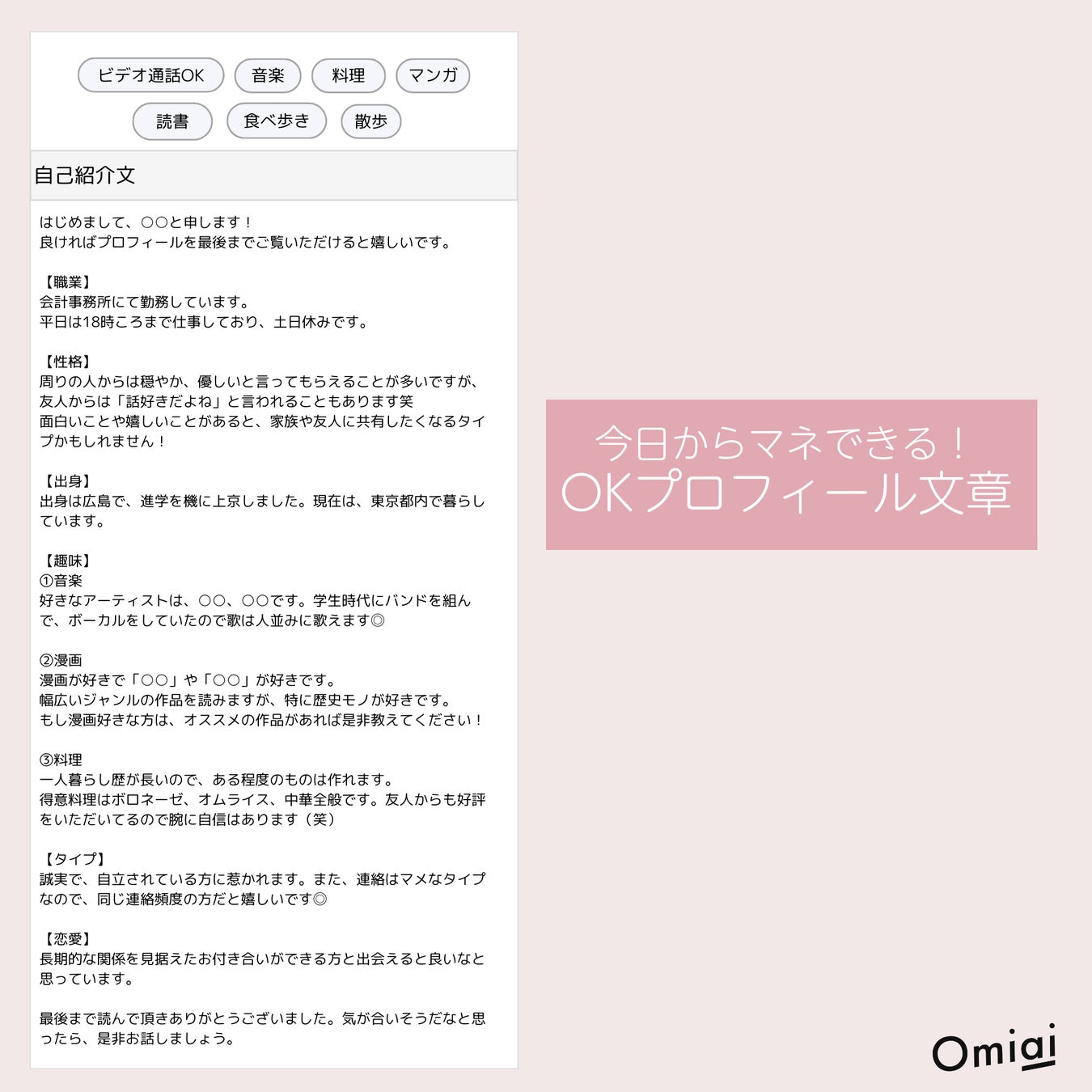 そのため、「よろしくお願いします」や「こんにちは」といった挨拶一文のみのメッセージや、「すぐに会いたい」等の真剣度が低い内容は避け、お相手のプロフィールに書いてある趣味や興味関心に沿った話題からやり取りを始めましょう。
