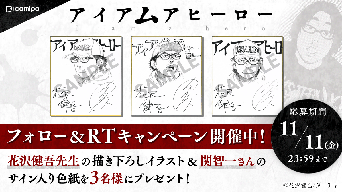ボイスコミック『アイアムアヒーロー』の配信開始を記念して、comipoの公式Twitterアカウント https://twitter.com/app_comipo において、作者である花沢健吾先生の直筆イラストと関智一さんのサインが入った色紙が3名様に当たるTwitterキャンペーンを開催いたします。