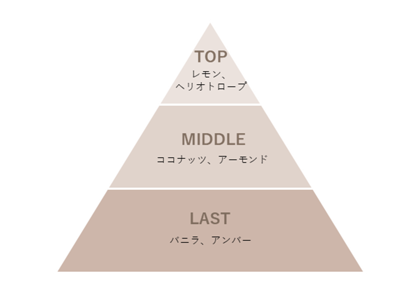 奥深い濃厚な甘さの中に官能さを秘めた、エレガントなスイートアンバー。ヘリオトロープのパウダリーな甘さにレモンを添えた爽やかなトップノートからはじまり、ココナッツ、アーモンドの芳醇な香ばしさが漂うミドルノートへ。ラストは温もりを感じるバニラとアンバーが存在感のある甘さで包み込む。