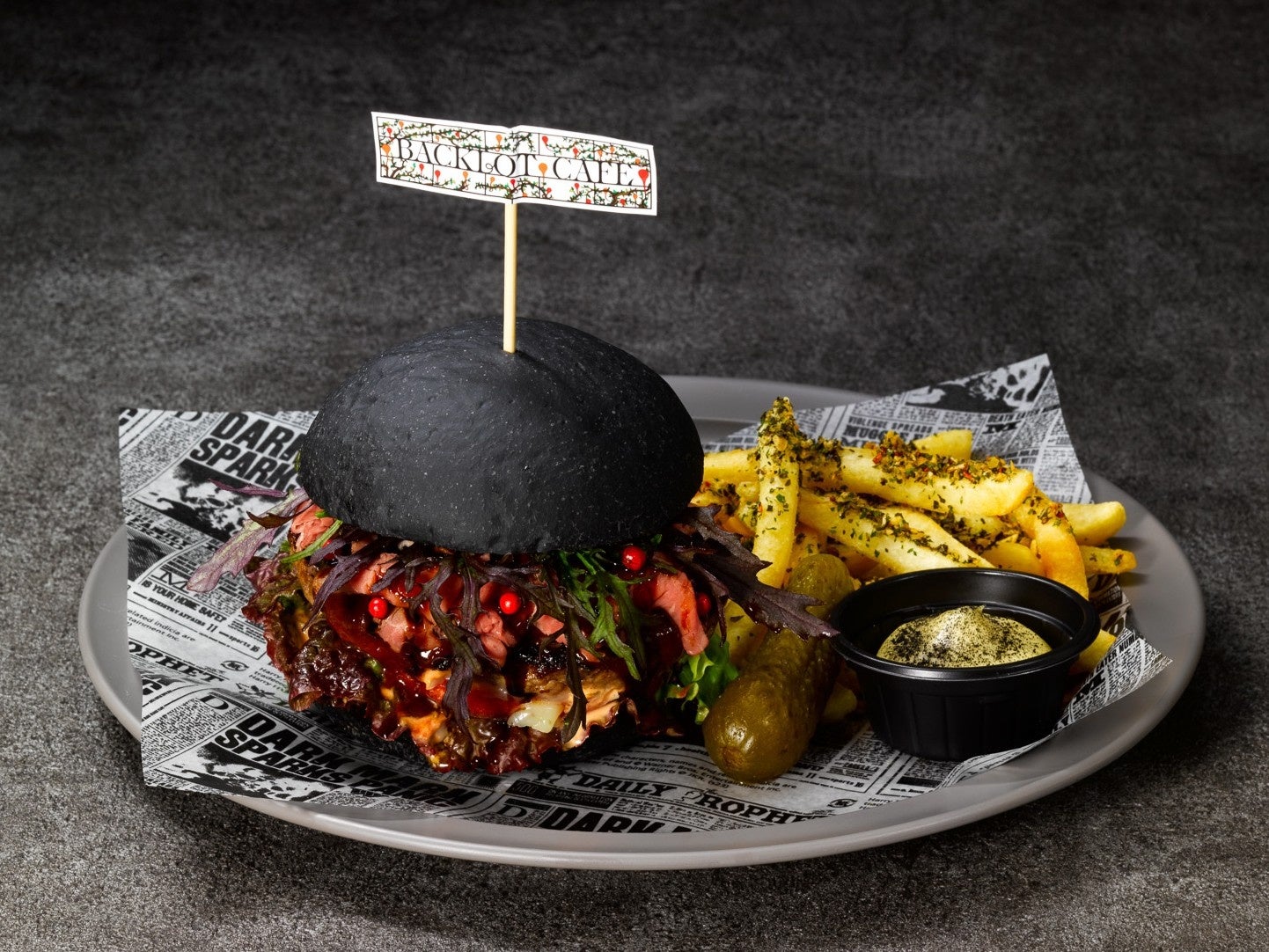 ハリーが初めてホグワーツへと足を踏み入れた“物語のはじまり”を追体験できる本企画にあわせ、映画の印象的なシーンをモチーフにしたスペシャルメニューが登場します。ハリーのもとに届いた大量の入学許可証を表現した「入学許可証のクレープ」は、3種のフレーバーであの象徴的な場面を再現。ホグワーツ魔法魔術学校での“組分けの儀式”をテーマにした「組分け帽子チョコレートタルト」は、カットすると4寮いずれかのカラークリームが現れる遊び心あふれる一品です。さらに、初のクィディッチ対戦をイメージした「クィディッチピザ ~グリフィンドールVSスリザリン~」や、物語後半の緊張感を象徴する「プレミアムバーガー ~禁じられた森~」も登場。黒いアイオリソースやバルサミコクリームソースで森の怪しげな雰囲気を演出し、映画の世界観を五感で楽しめるメニューが揃っています。