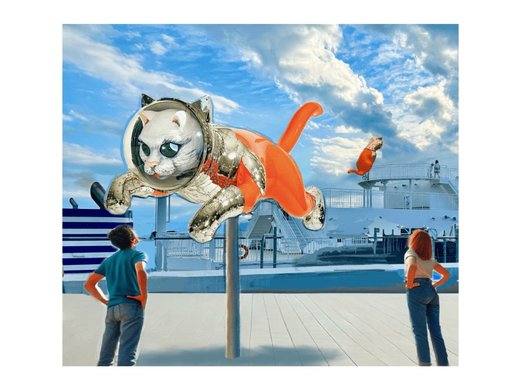本作品は、船の守り神として知られる“船乗り猫”をモチーフにした現代アート作品で、実際に船の上に設置されるのは初の試みです。