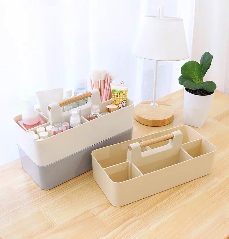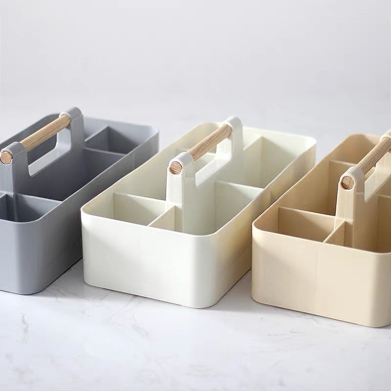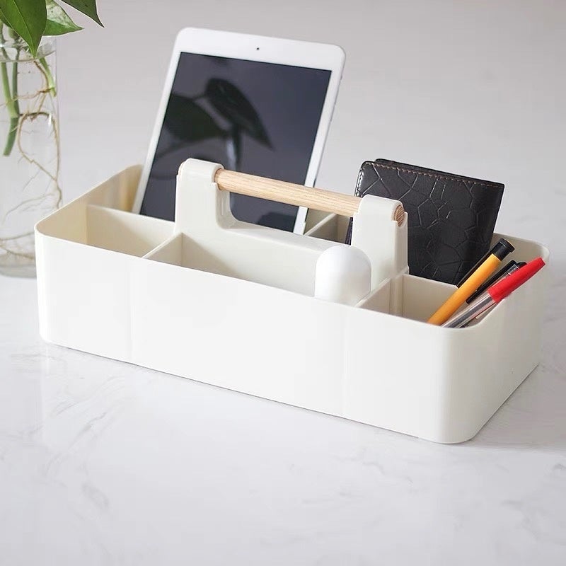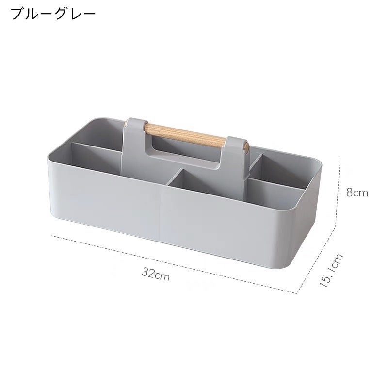 モノに合わせて仕分けやすいサイズの異なるポケットを組み合わせた収納ケースです。ハンドル付きなので持ち運びも簡単で、同じケースを揃えればぴったり重ねることもできます。