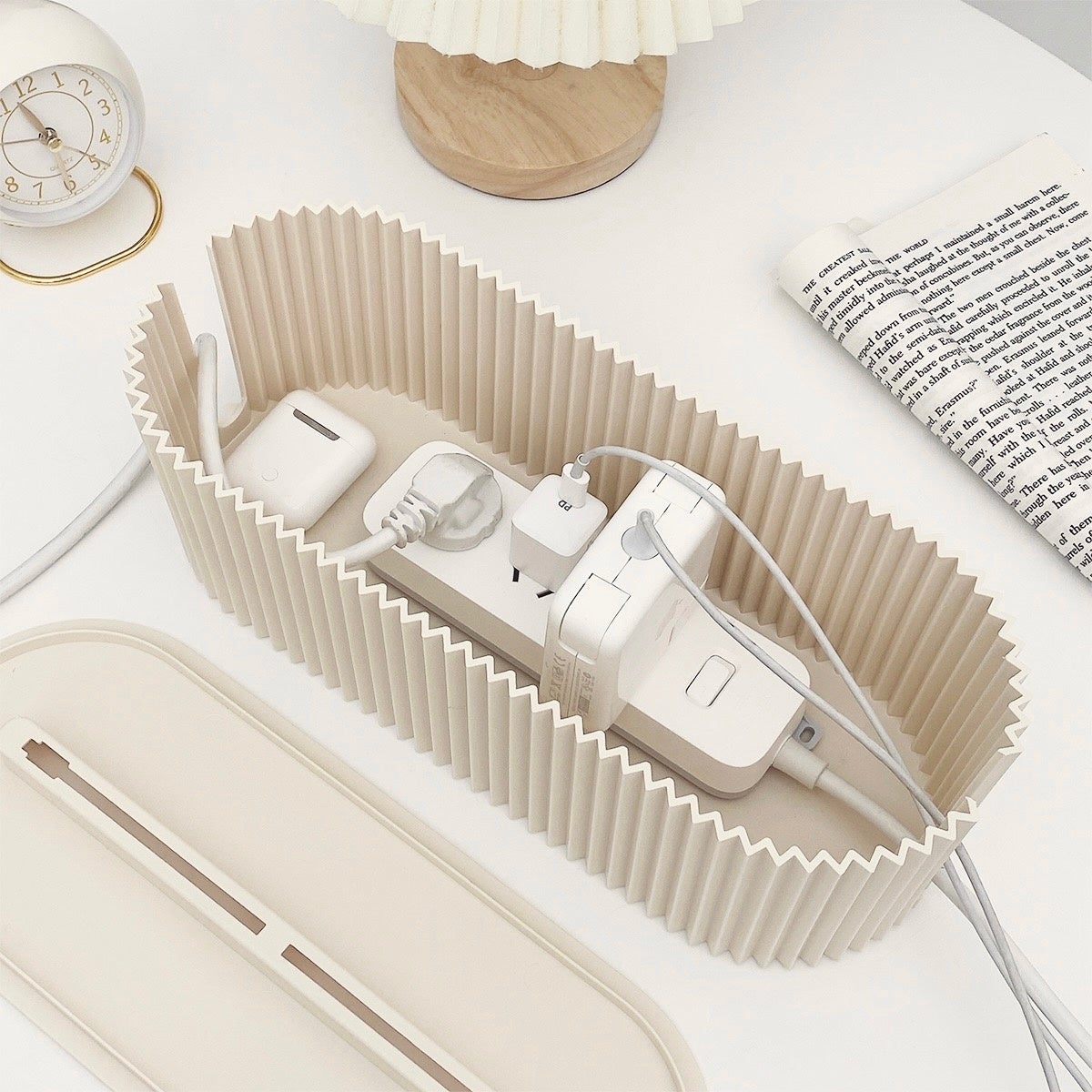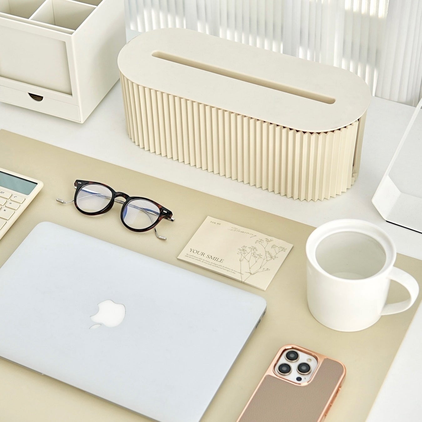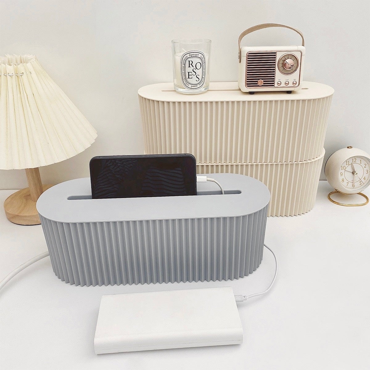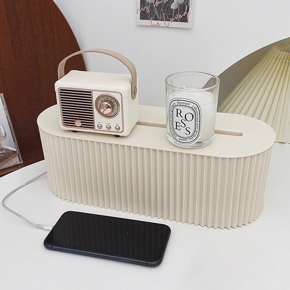 電源タップとケーブルをすっきり収納できるケースです。側面のなみなみの凹凸が無機質さを払拭し、オシャレな雰囲気を演出します。上部の隙間はスマホやタブレットを立てかけての使用も可能です。