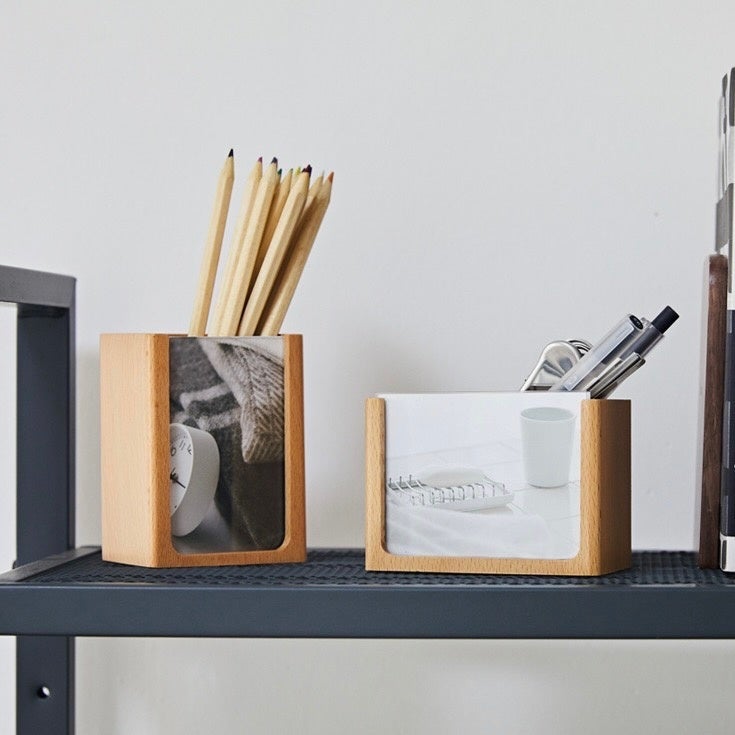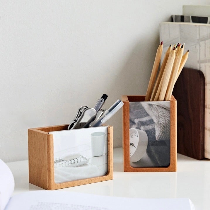 前面の写真を自由に差し替えられる木製ペンスタンドです。オシャレなイラストを挟んでも、推しの特別な1枚を挟んでも目に入る度にモチベーションアップ間違いなし。ペンなどの文房具以外にも、コスメブラシスタンドとしてもお使いいただけます。