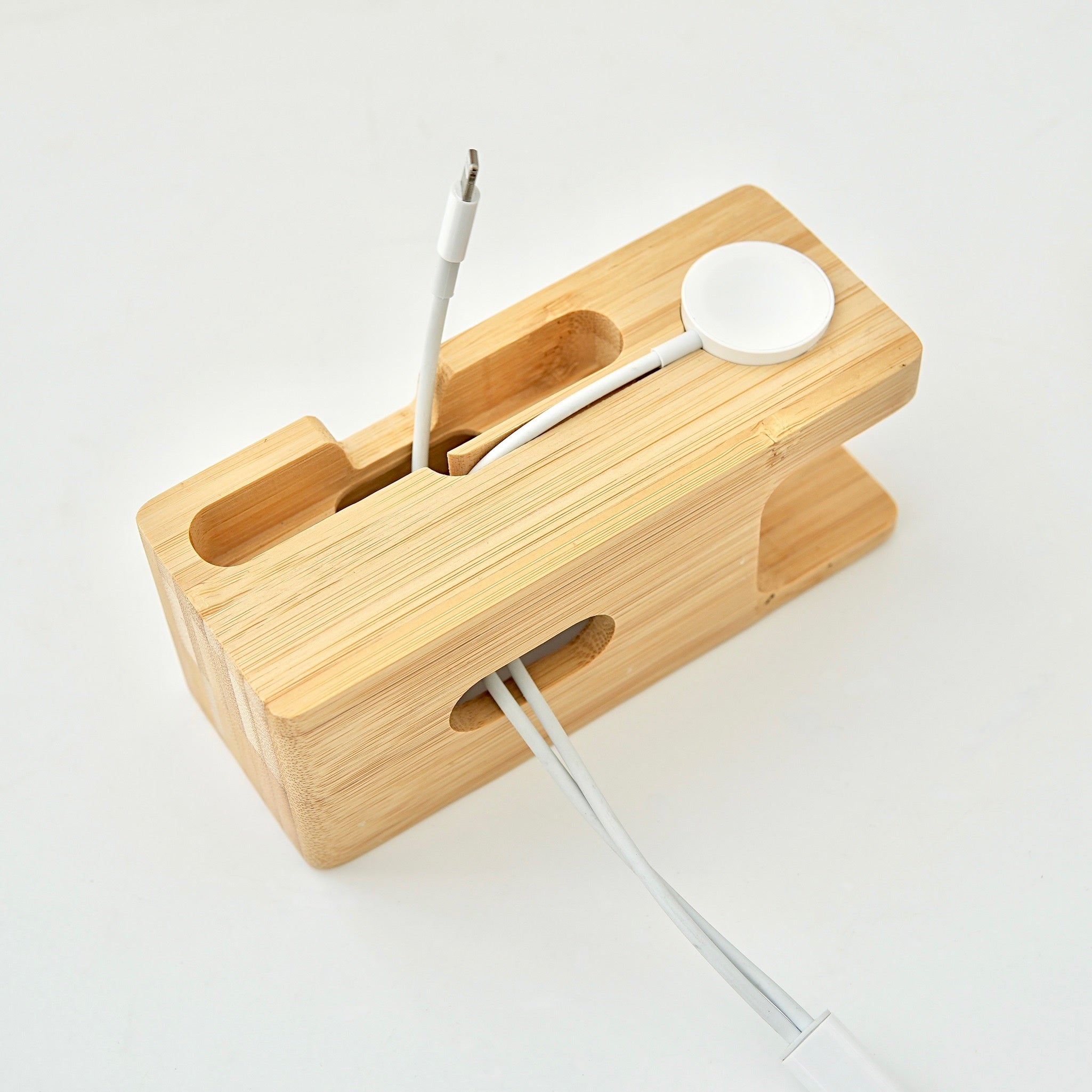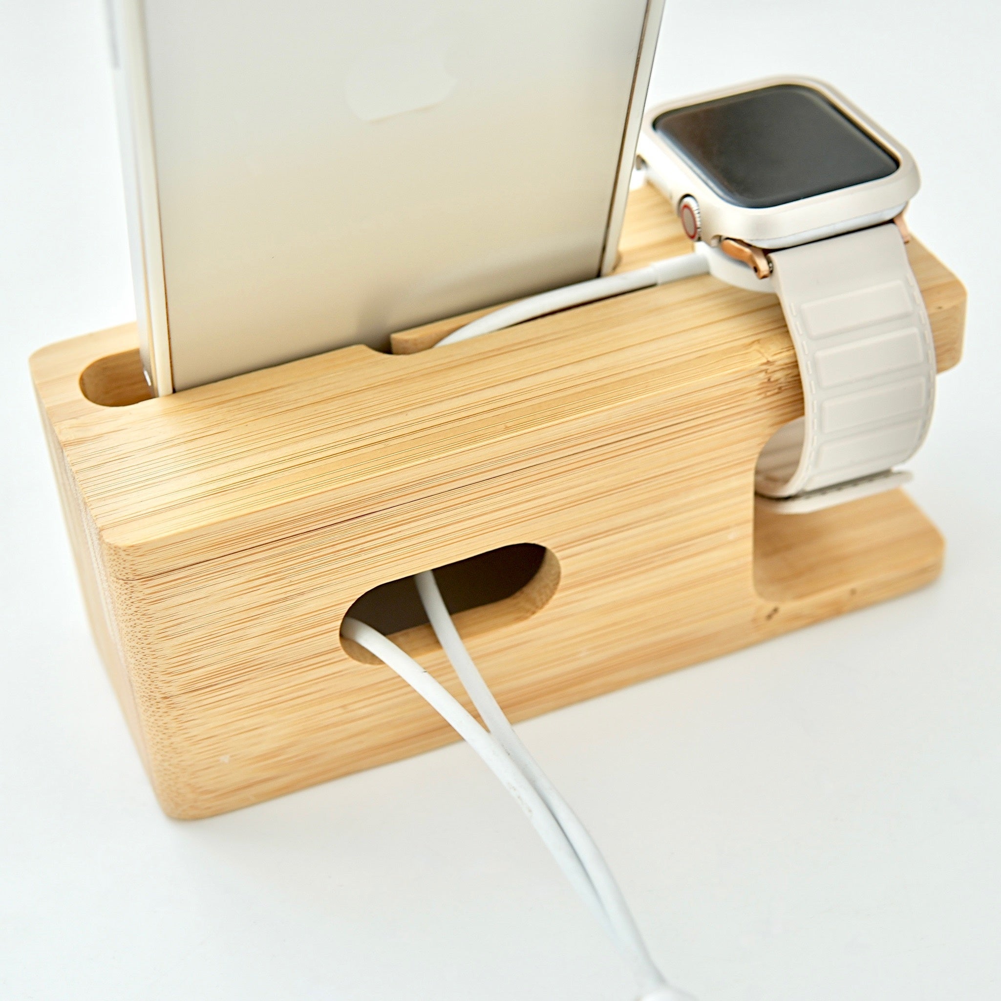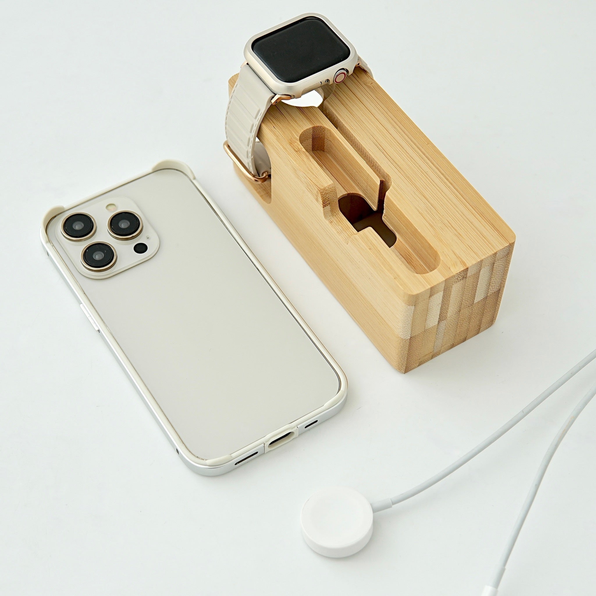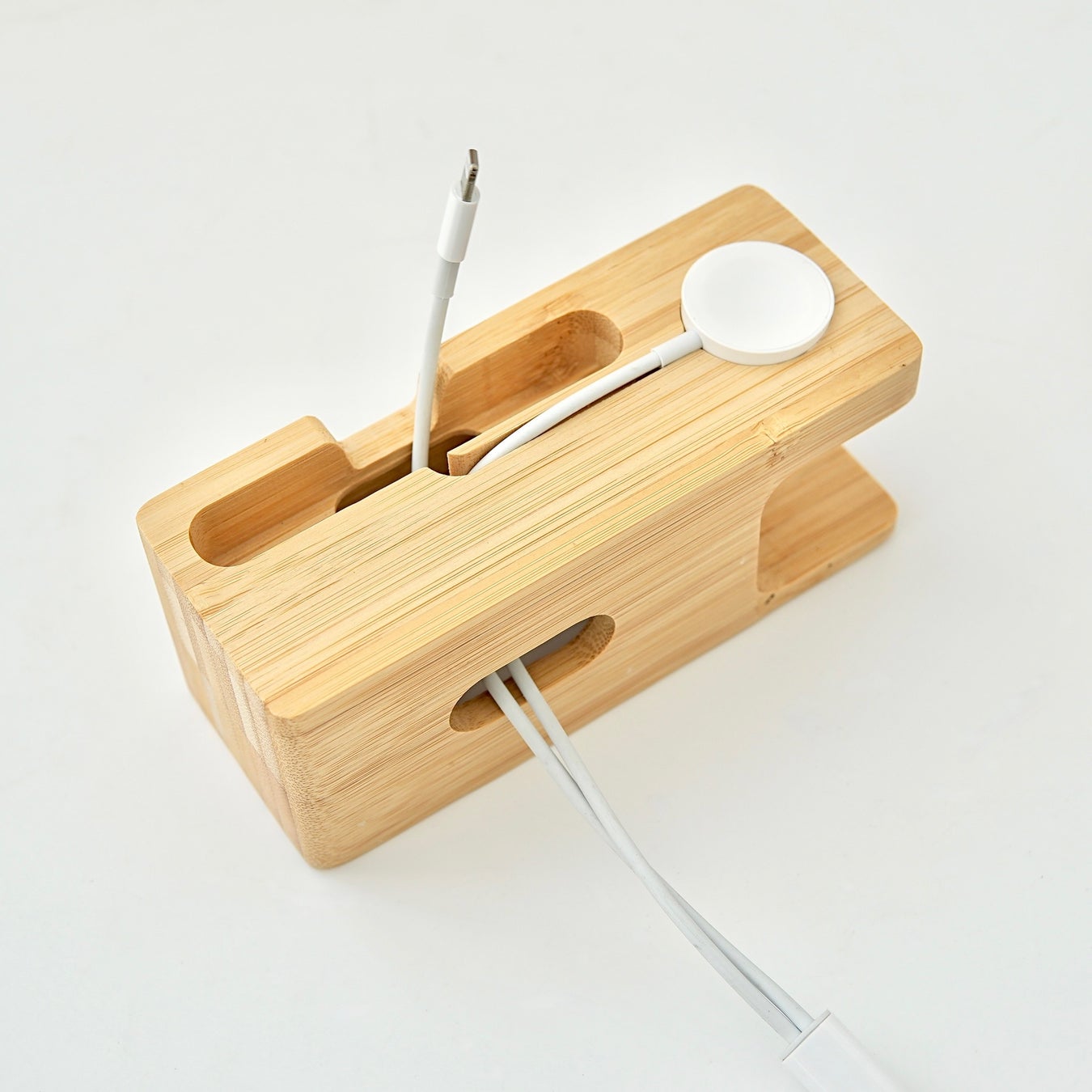 ナチュラルですっきりとしたシルエットの竹製スタンドです。アップルウォッチとスマホを同時に預けて充電できます。充電ケーブル用のガイド溝もついており、スマートさと実用性も抜群です。