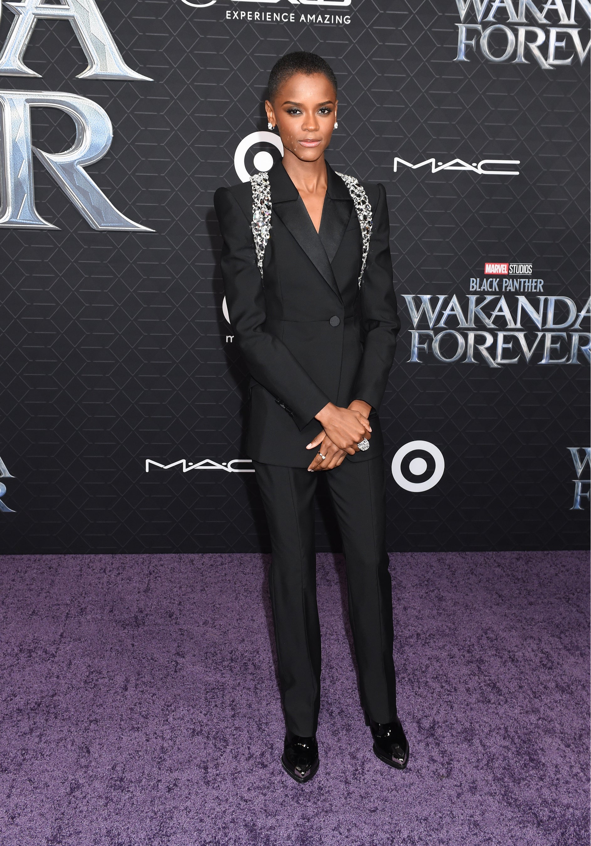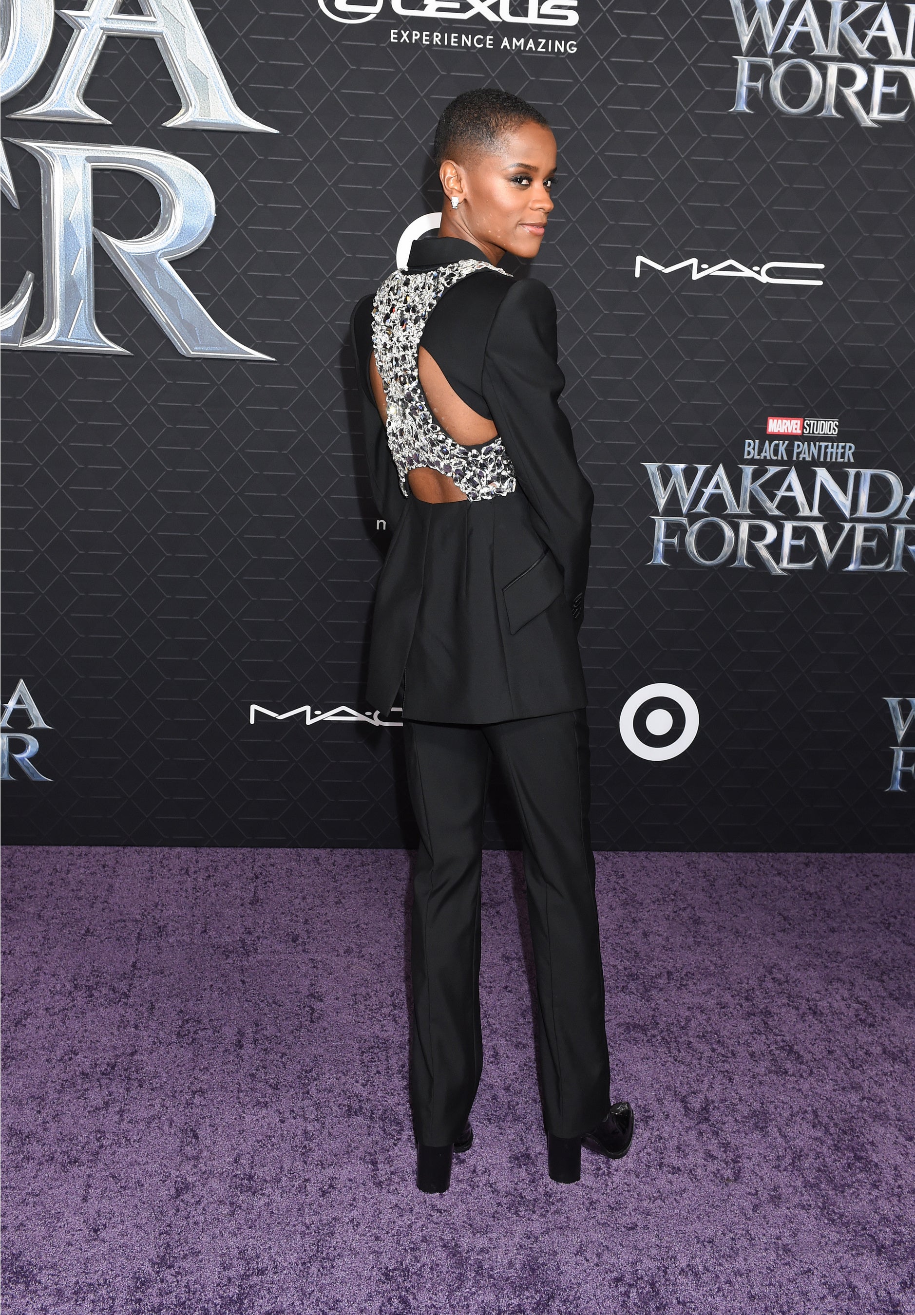 10月26日カリフォルニアで開催されたマーベル・スタジオによる「ブラックパンサー/ワカンダ・フォーエバー」のワールドプレミアにて、レティシア・ライトが、ウエストと背中部分にカットアウェイ、クリスタルハーネスの刺繍を施したテーラードジャケットとブーツカットトラウザーにパンクチェルシーブーツを着用して登場しました。