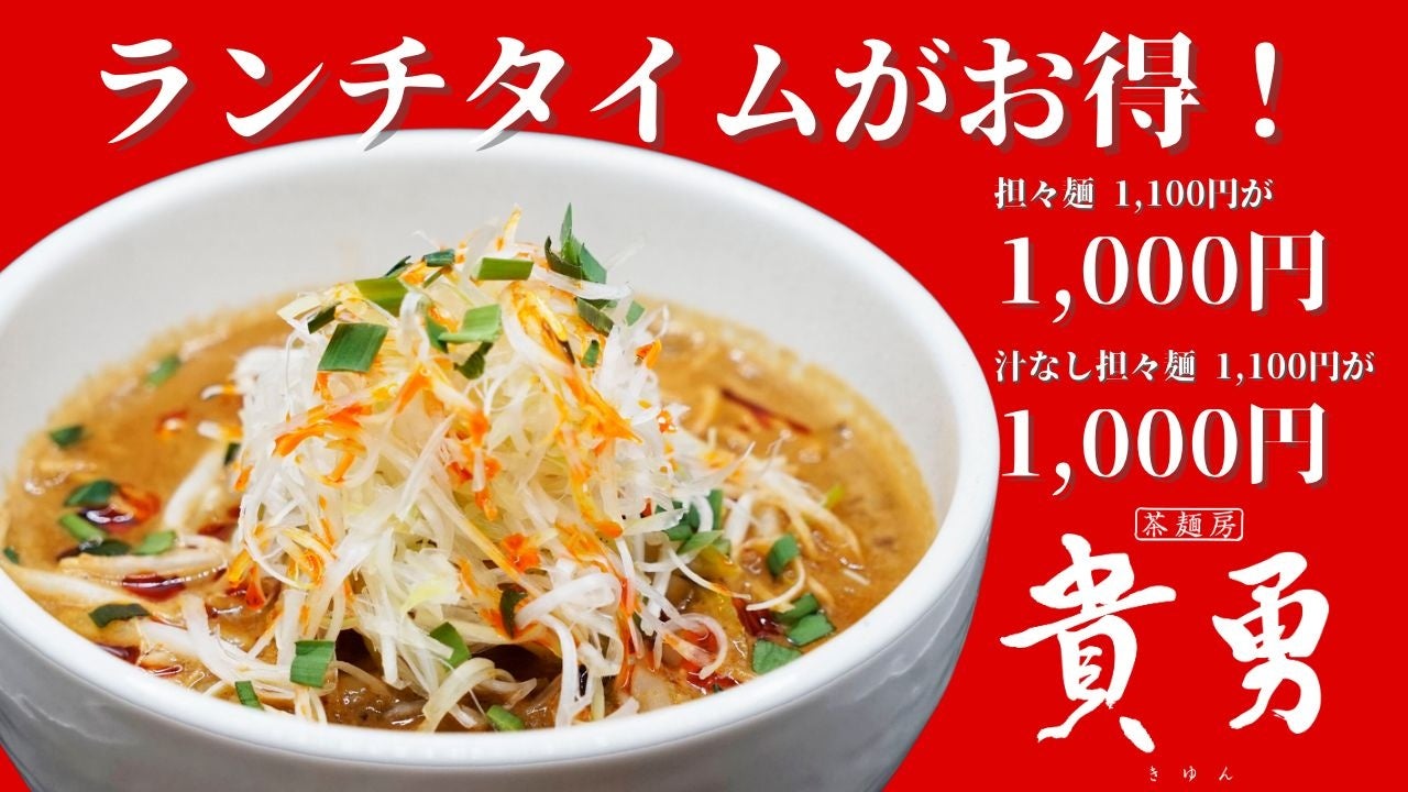 ランチタイム(平日11:00〜16:00)の担々麺と汁なし担々麺が100円値下げ、1,000円(税込)でのご提供となります。