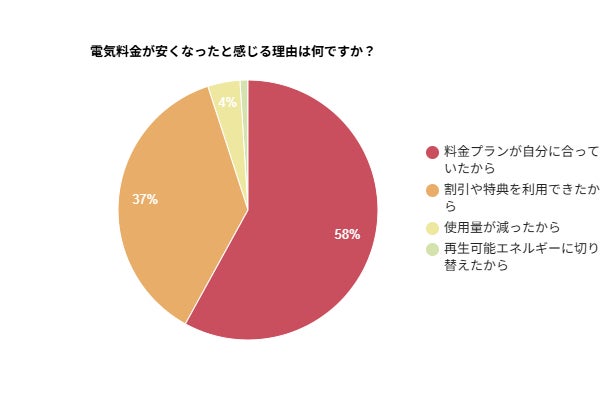 電気料金が安くなったと感じる理由として、「料金プランが自分に合っていたから」が最も多く58%、次いで「割引や特典を利用できたから」が37%と全体の95%を占めました。料金面や割引などの面で、安くなったと感じる人が多いことが明らかになりました。