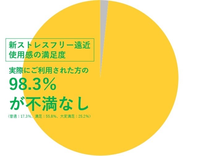 2023年7月1日~31日に静岡県内の眼鏡市場にて『新ストレスフリー遠近』のテスト販売を実施。その使用感について満足度調査にお答えいただいたところ、98%の方が不満なしとの回答でした。