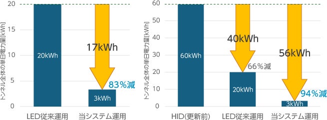 今回導入したシステムにおける単日のトンネル照明器具の電力比較(※1)において、LED従来運用の17kWhから3kWhと83%の削減を実現しました。