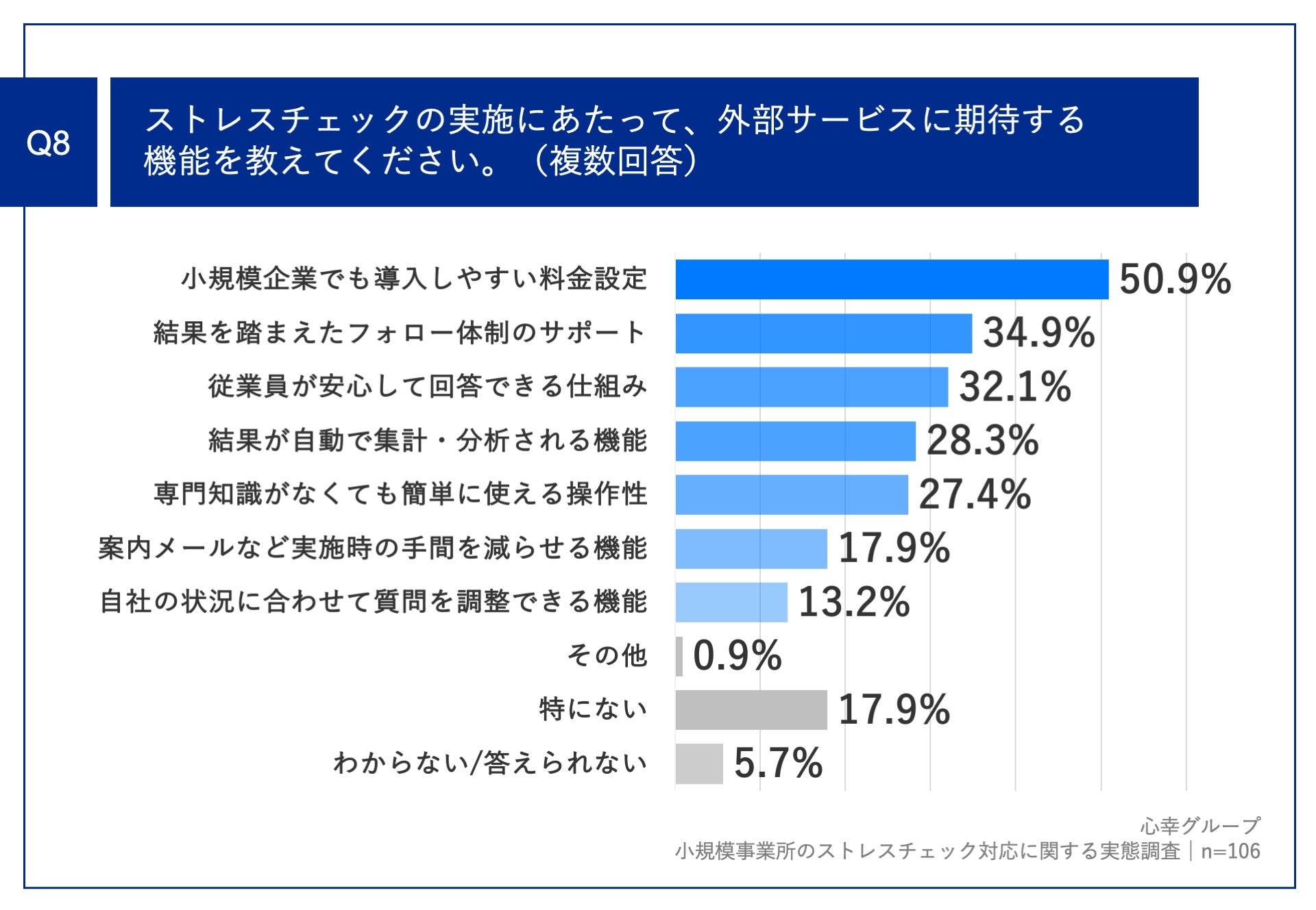 「Q8.ストレスチェックの実施にあたって、外部サービスに期待する機能を教えてください。(複数回答)」(n=106)と質問したところ、「小規模企業でも導入しやすい料金設定」が50.9%、「結果を踏まえたフォロー体制のサポート」が34.9%、「従業員が安心して回答できる仕組み」が32.1%という回答となりました。