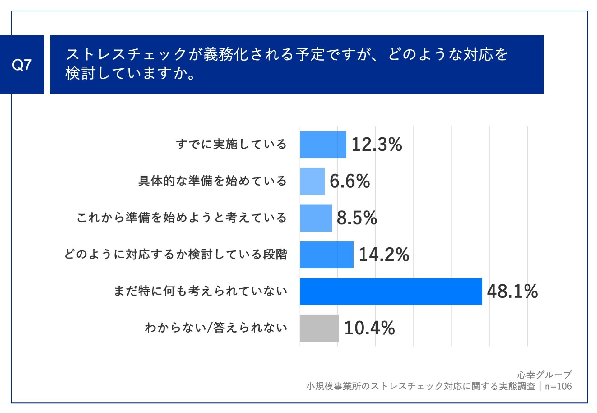 「Q7.ストレスチェックが義務化される予定ですが、どのような対応を検討していますか。」(n=106)と質問したところ、「まだ特に何も考えられていない」が48.1%、「どのように対応するか検討している段階」が14.2%、「これから準備を始めようと考えている」が8.5%という回答となりました。