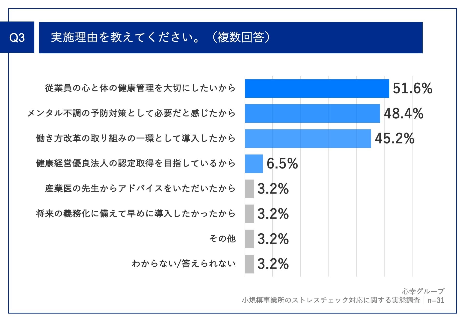 Q1で「年に1回など定期的に実施している」「必要に応じて不定期で実施している」と回答した方に、「Q3.実施理由を教えてください。(複数回答)」(n=31)と質問したところ、「従業員の心と体の健康管理を大切にしたいから」が51.6%、「メンタル不調の予防対策として必要だと感じたから」が48.4%、「働き方改革の取り組みの一環として導入したから」が45.2%という回答となりました。