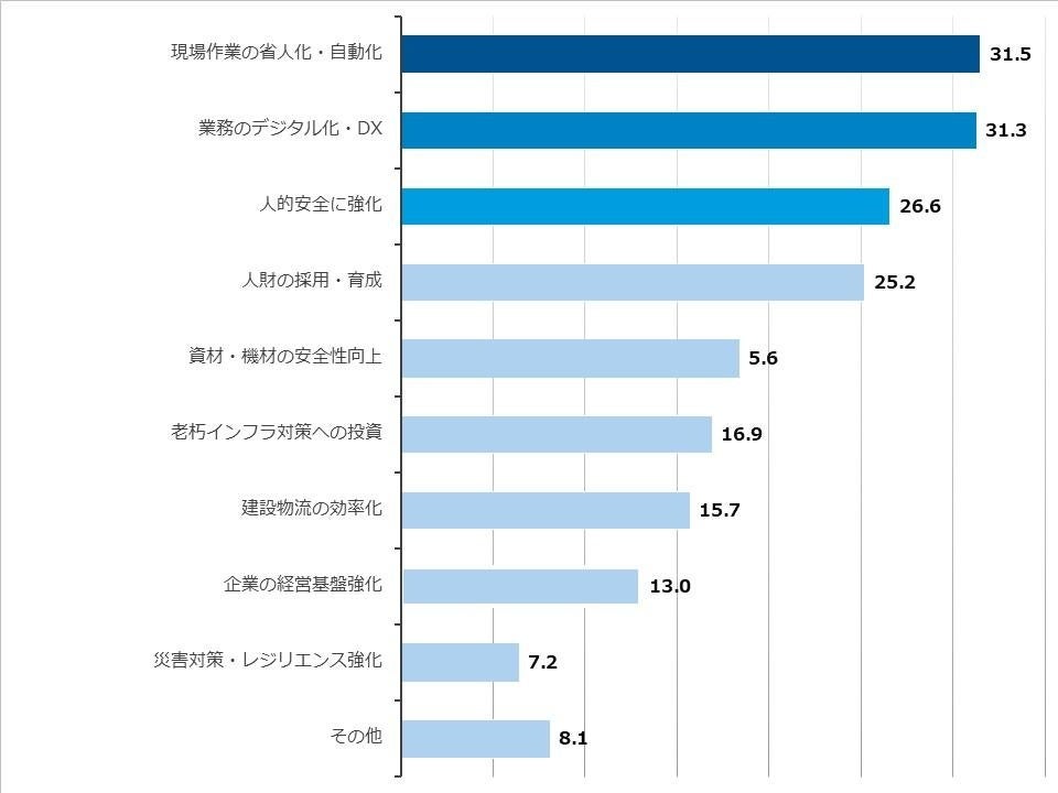 ・今後10年を見据えて最優先で投資すべき分野としては、「現場作業の省人化・自動化」が31.5%で最多となり、「人的安全の強化」31.3%、「業務のデジタル化・DX」26.6%が続いた。