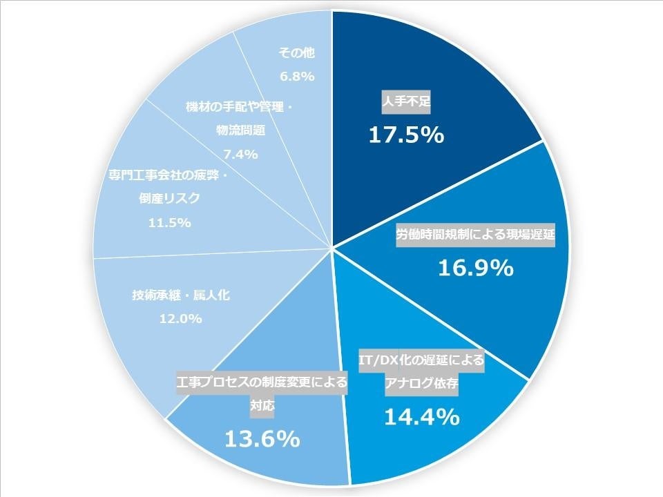 時間外労働の上限規制が本格適用された「2024年問題」や、ITシステムの老朽化・人材不足・デジタル化の遅れが企業経営に影響を及ぼすとされる「2025年の壁」といった社会的な変化を経て、建設現場がどのような影響を受けているのか、また、どの工程や分野に課題が集中しているのかについて調査を行いました。