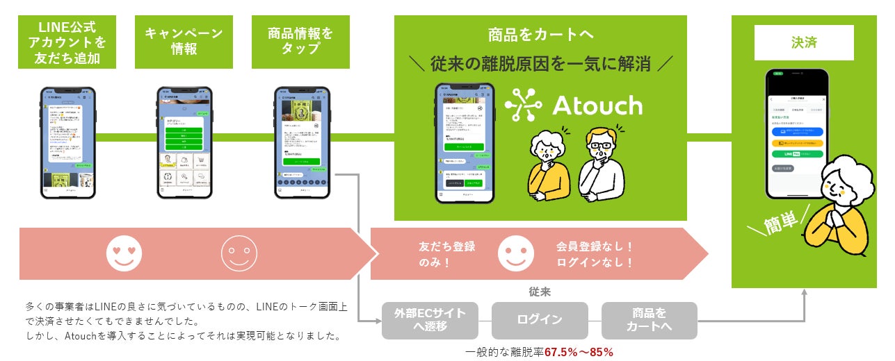 これまで培った経験とノウハウを基に、2022年10月にLINE公式アカウントAPIツール「Atouch(アタッチ)」をローンチ。AtouchとLINE公式アカウントを連携することで、企業がトーク画面に商品を陳列、決済カートを設置できるようになりました。また、顧客がトーク画面上で商品を選択、カートに入れ、そのままIDやパスワードを設定することなく決済してお買い物を完了できる仕組みの提供も実現しました。