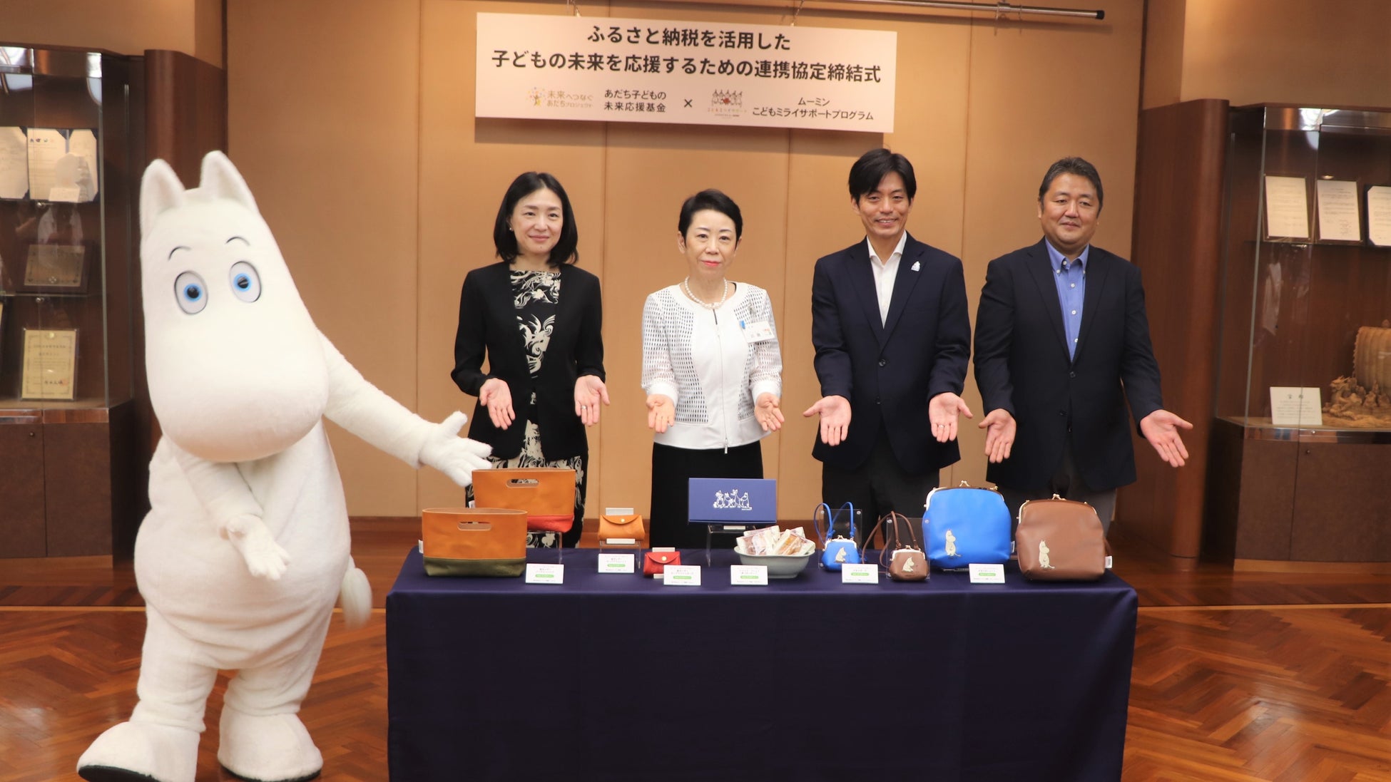 ふるさと納税を活用した子どもの未来を応援するための連携協定締結式には、北欧発祥の人気キャラクター「ムーミン」の日本でのライセンスを一括管理する株式会社ライツ・アンド・ブランズ(東京都港区)の 伊東 久美子 代表取締役社長、ムーミンバレーパークを運営する株式会社ムーミン物語(埼玉県飯能市)の 小幡 匡志 代表取締役社長が出席。
